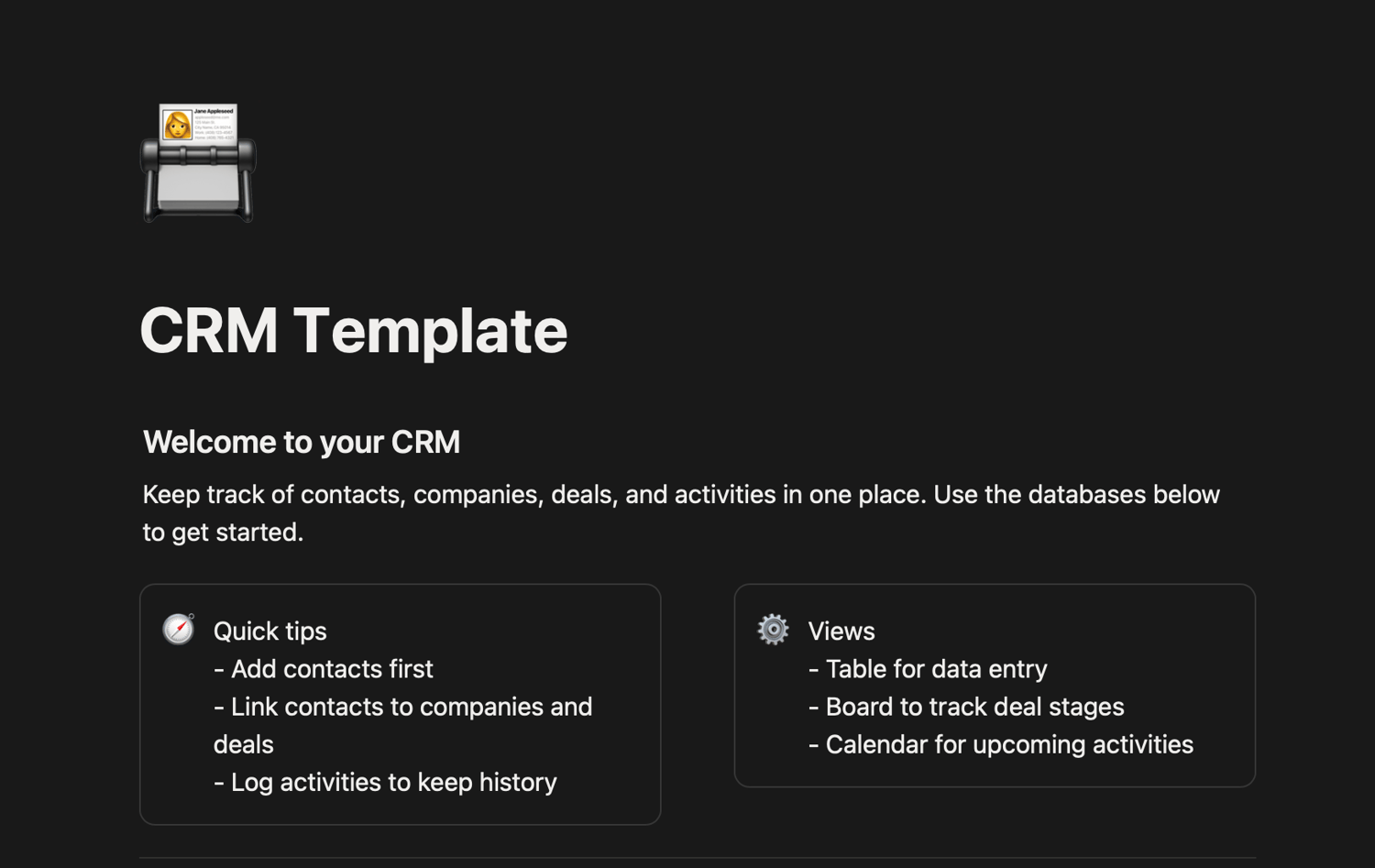 I set up a CRM template on this page with four linked databases: Contacts, Companies, Deals, and Activities. Each has sensible properties and starter views, including a Deals pipeline board and an Activities calendar.