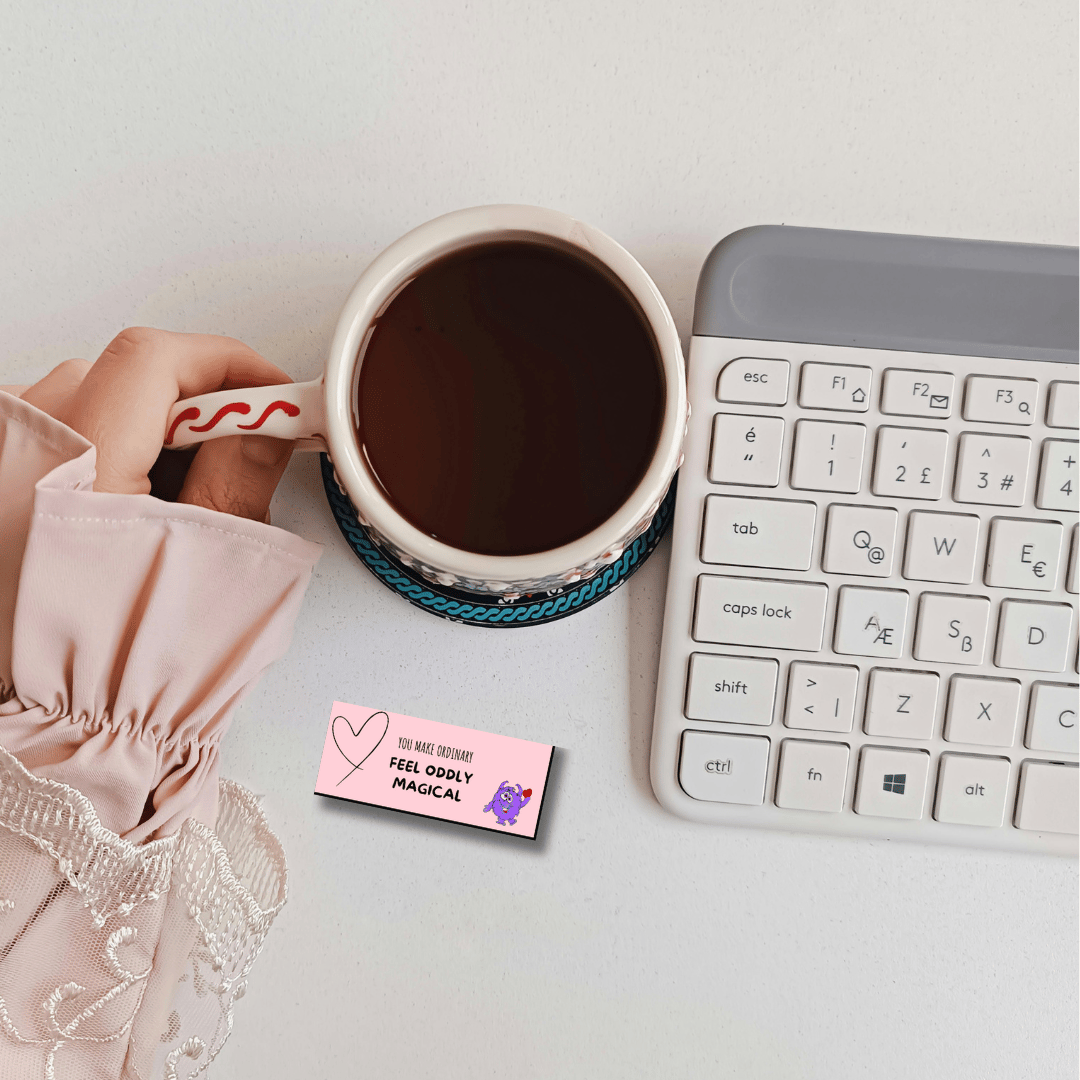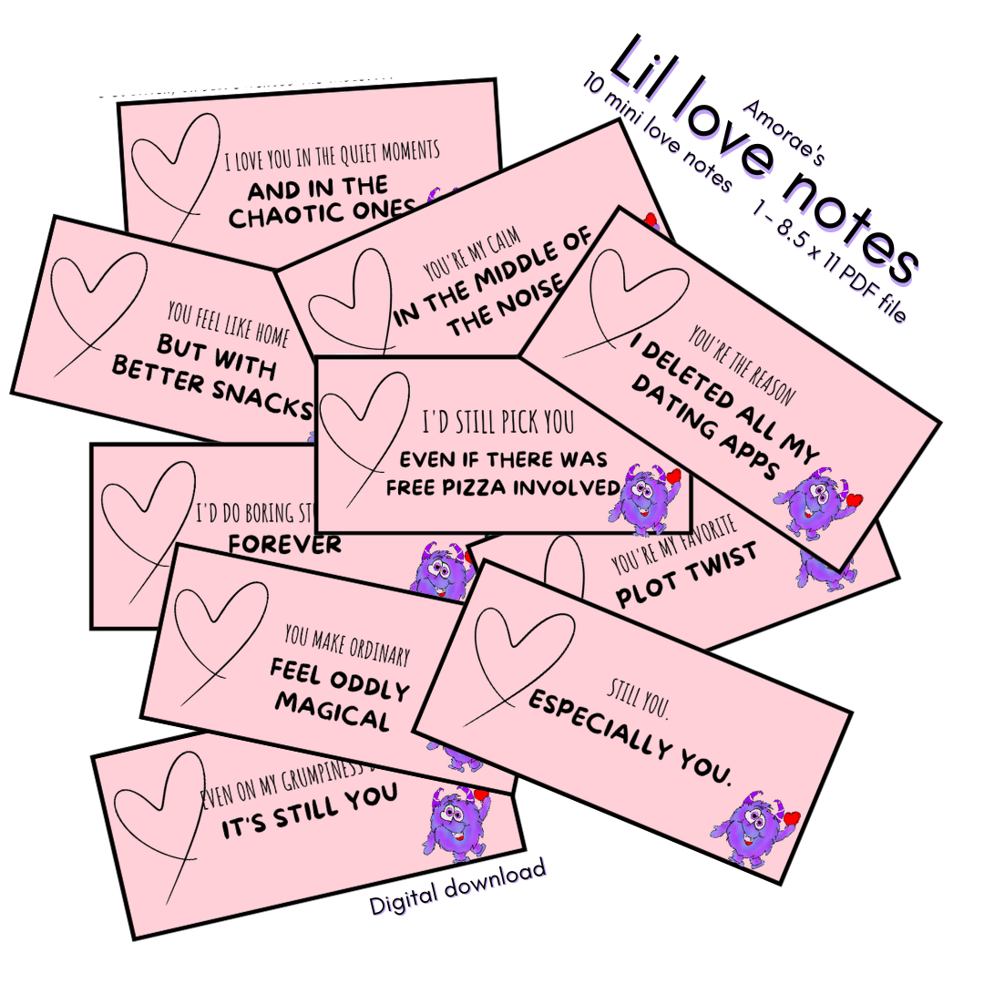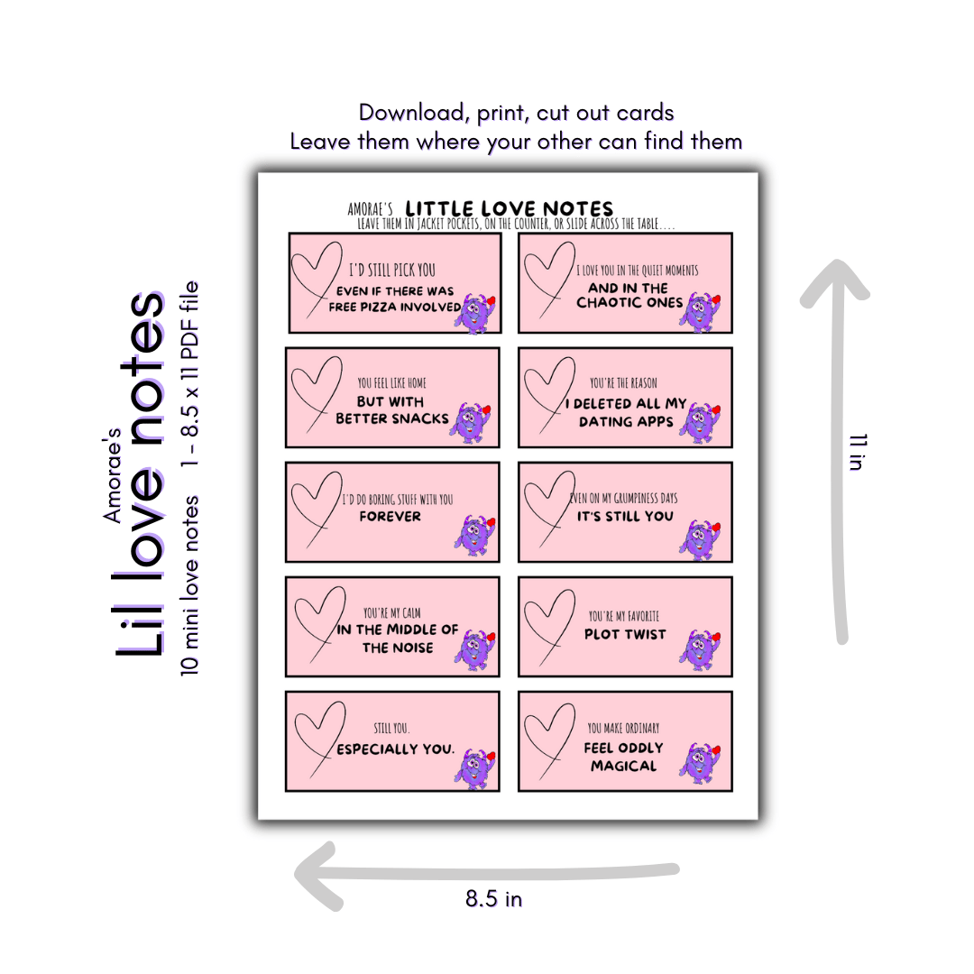 This printable set includes 1 PDF page of 10 mini love note cards, each featuring a short, quirky sentiment you can leave behind for your person. Tucked into a pocket, slipped onto a pillow, hidden in a lunch bag, or left on the counter for later.