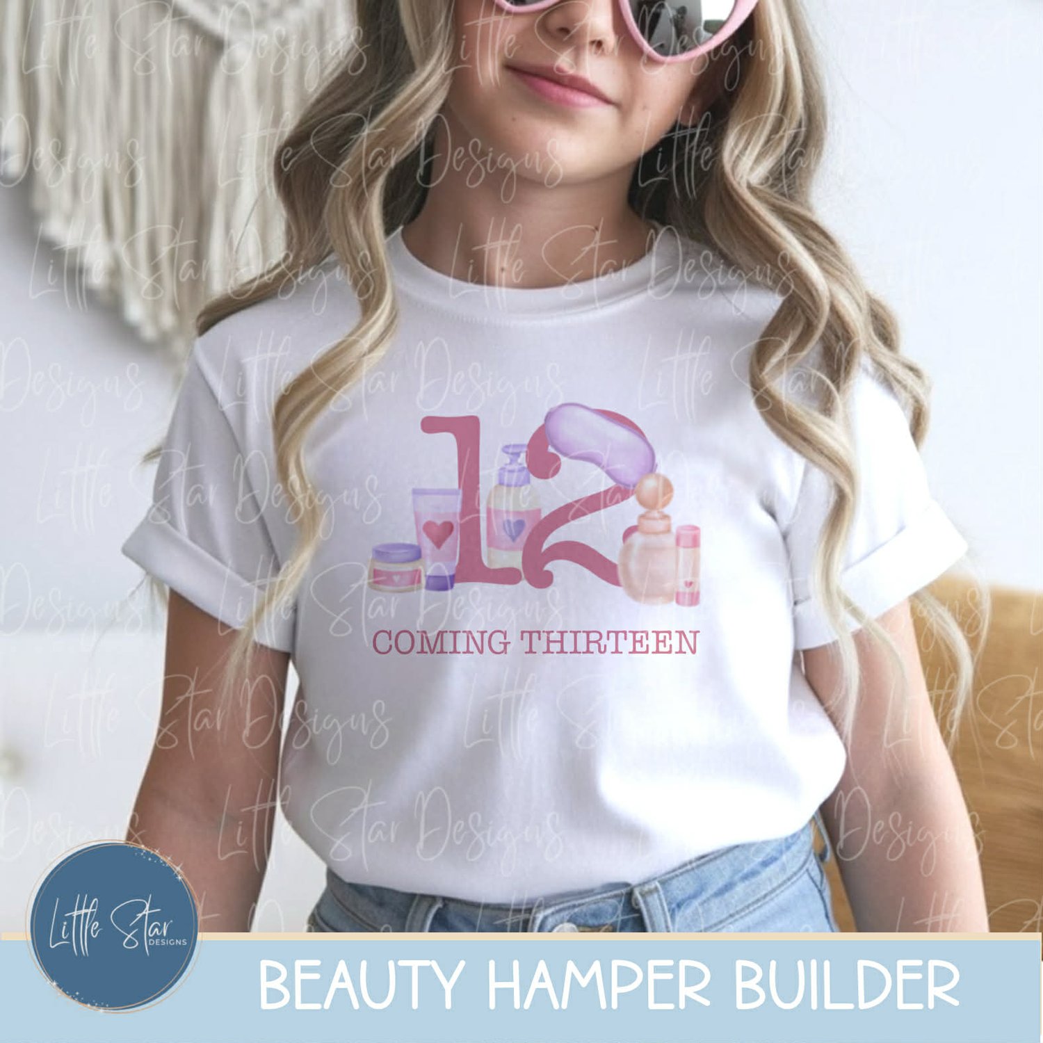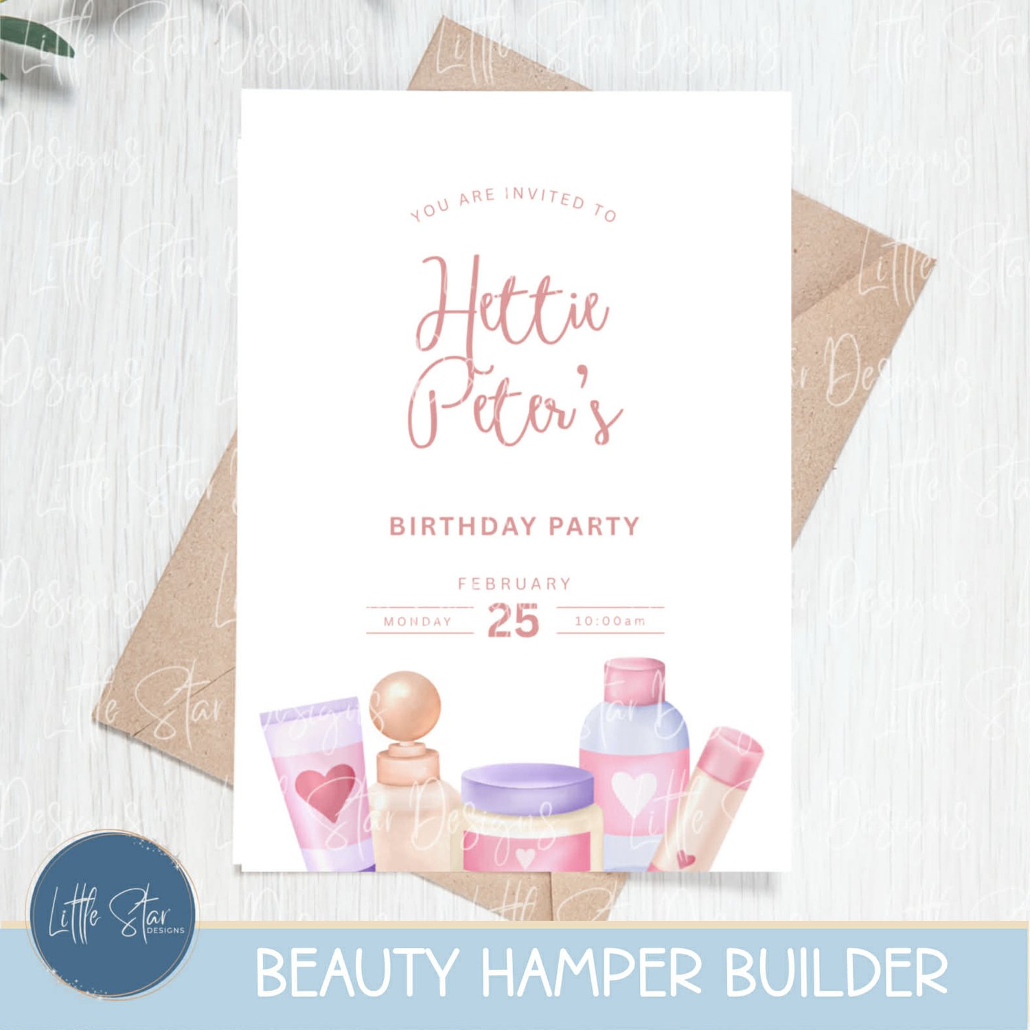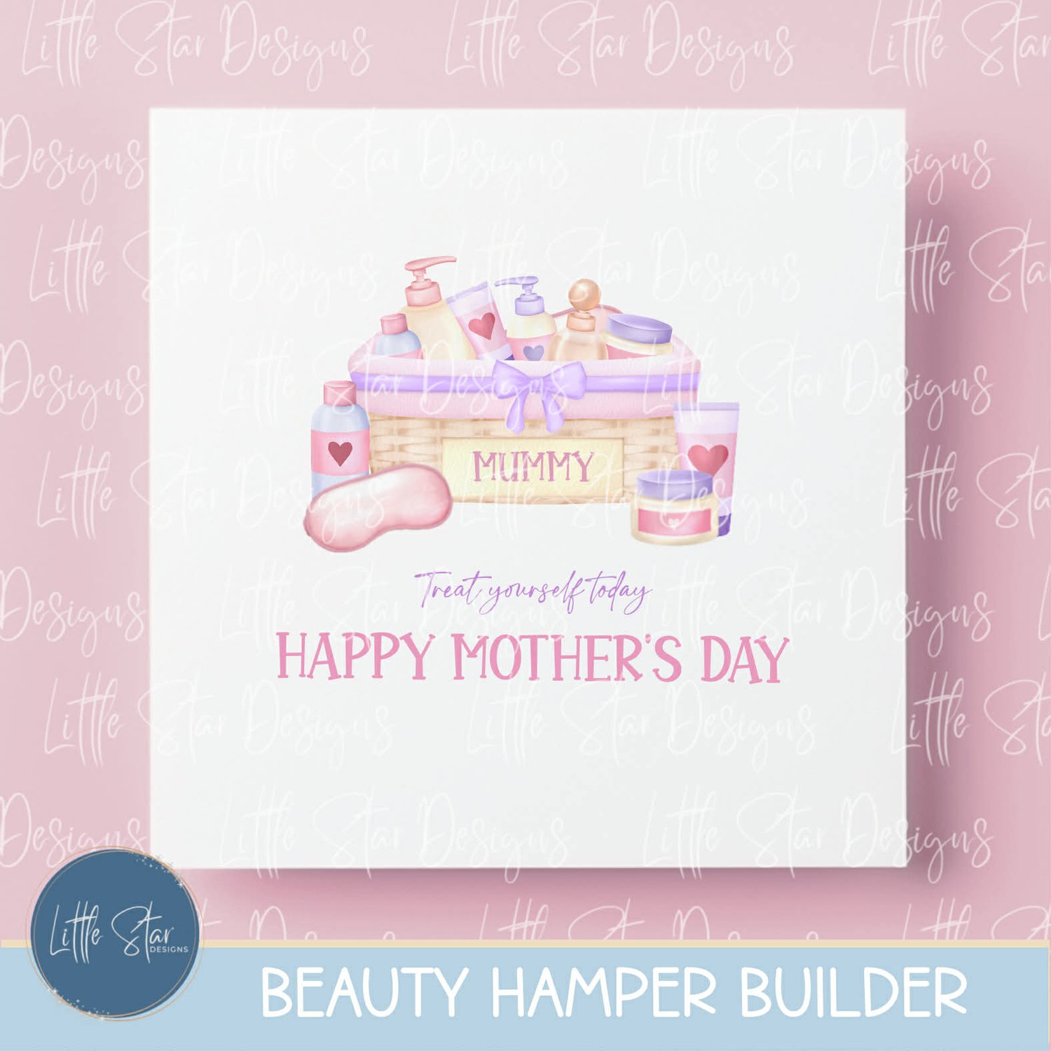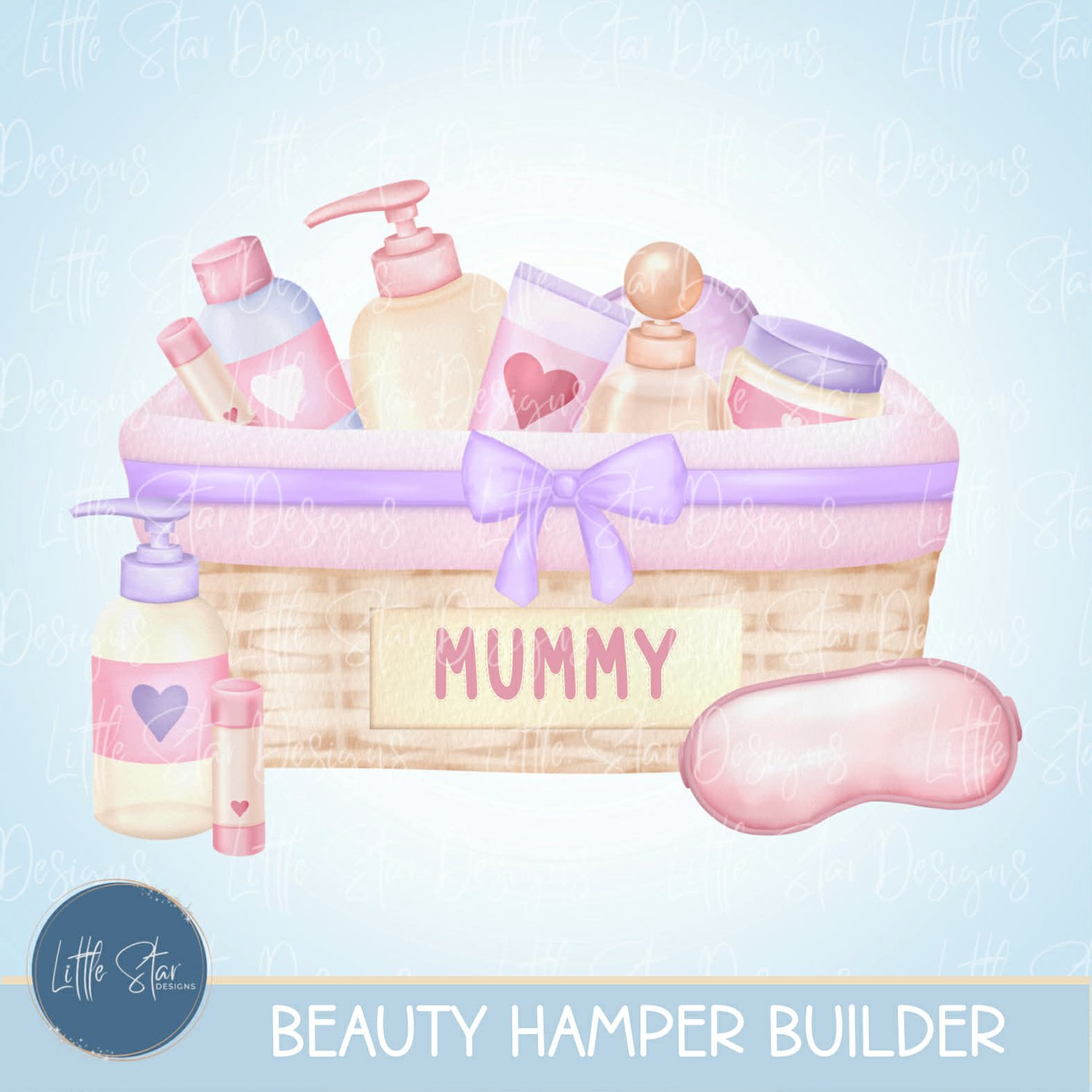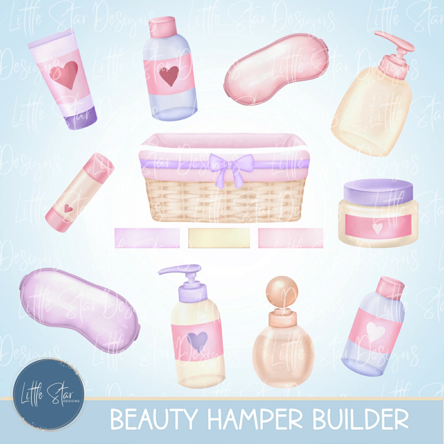 This is a high-quality hand drawn (300dpi PNG) clipart set digital download of my original artwork, titled “Beauty Hamper Builder”, designed for sublimation and print.