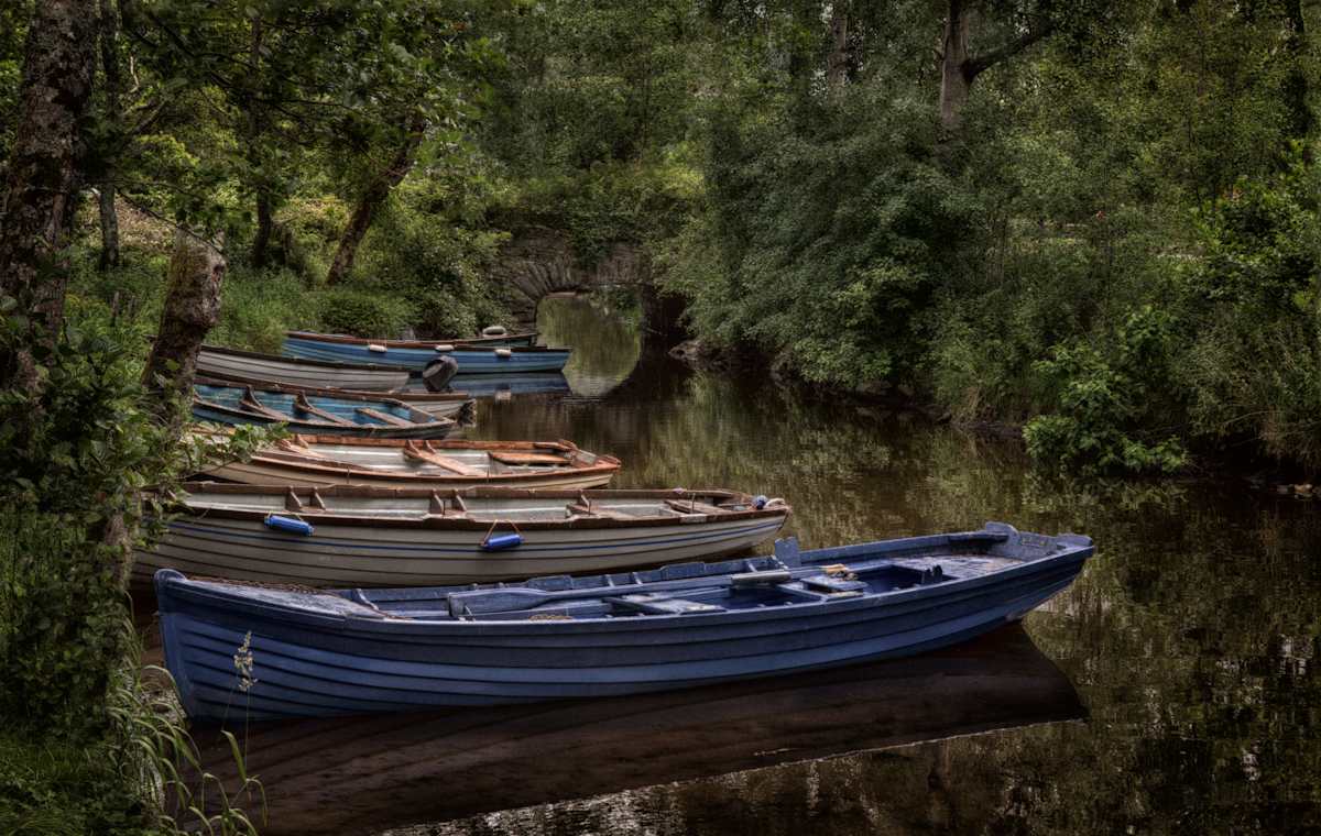 - Notes from the Artist: "Row of Boats" was taken in Ireland in 2015. I was on a hiking trip with a large group. I always seemed to be lagging behind; maybe it was because of all my stops to take pictures. One particular day as I lagged behind, I came across these rowboats and a little bridge in the background. My first thought was "what a peaceful place this is." I loved how the boats led my eyes to the little bridge overgrown with lush leaves. This location brought such inner peace and serenity. With the gentle light over the scene, from the boats to the lush trees, the reflections are very subtle, yet strong. The boats play such a dynamic role in taking the viewer's eye from the foreground to the background. This image has strong texture yet conveys such tranquility. My love for nature, design, and texture came together for this image.