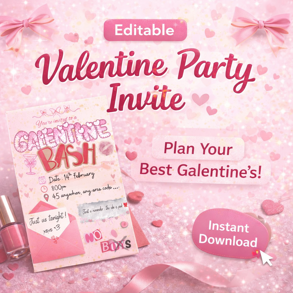 Celebrate Galentine’s Day in style with this cute, pink, and playful Galentine Bash Invitation ✨
