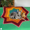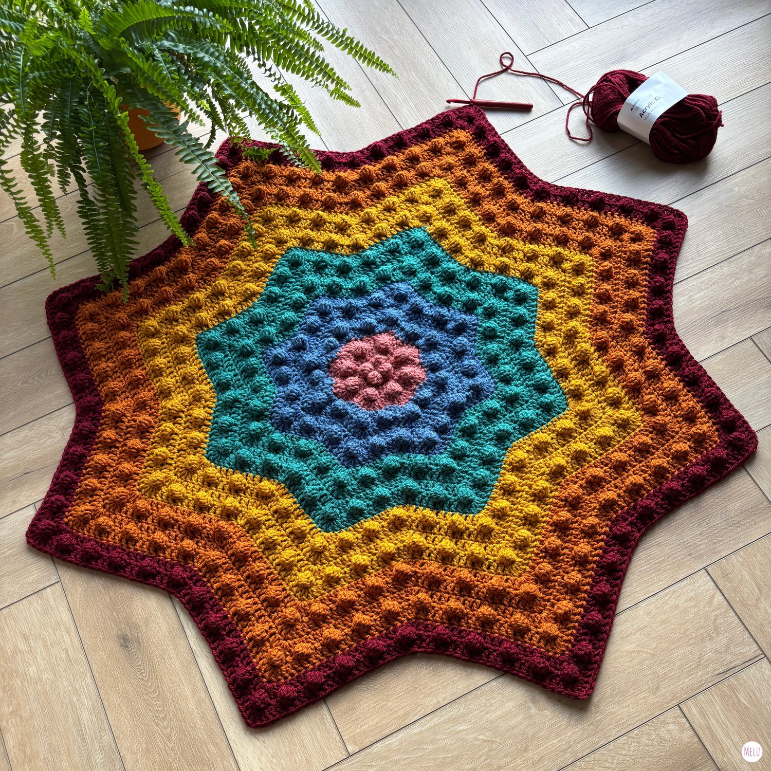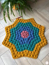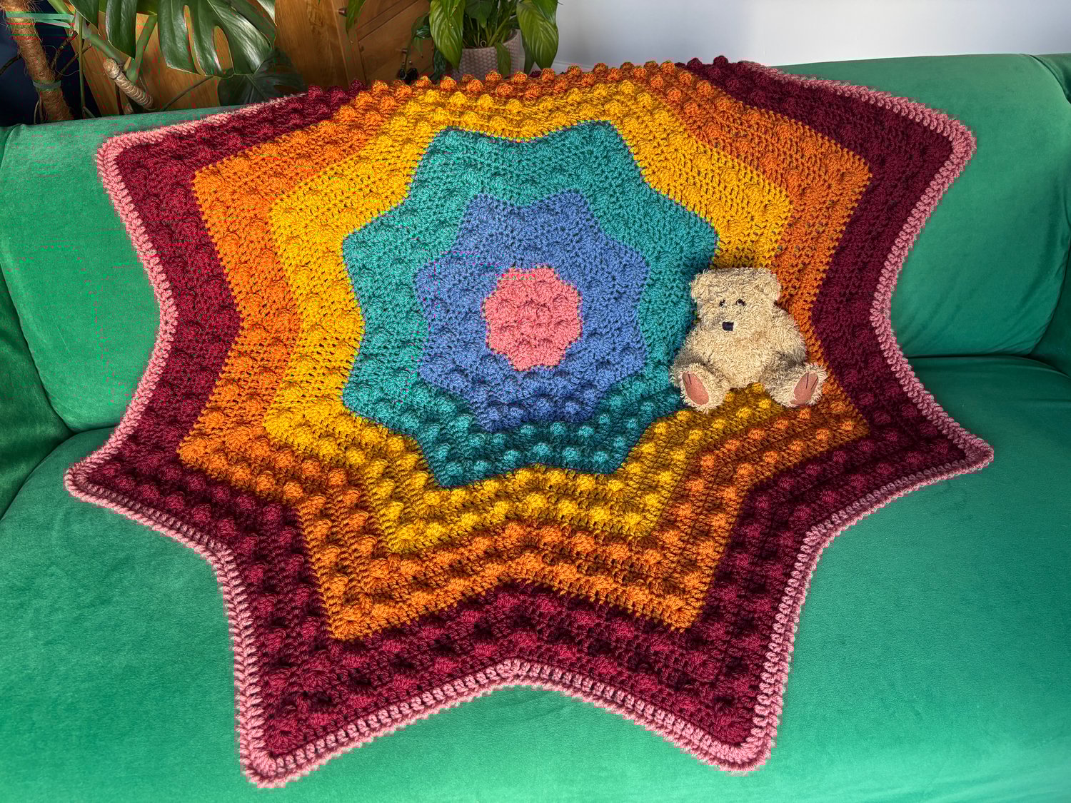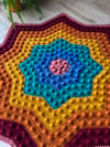 The Nebula Bobble Star Dark Rainbow Blanket is a striking, star shaped crochet blanket featuring a beautifully textured bobble pattern that radiates outwards like a glowing nebula.
