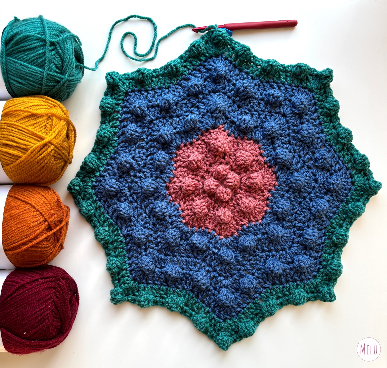 The design forms a repeating, rhythmic sequence that is calming and mindful to work through. It uses simple crochet stitches alongside a classic bobble stitch to create a rich, textured fabric that looks impressive without being fiddly or frustrating to make.
