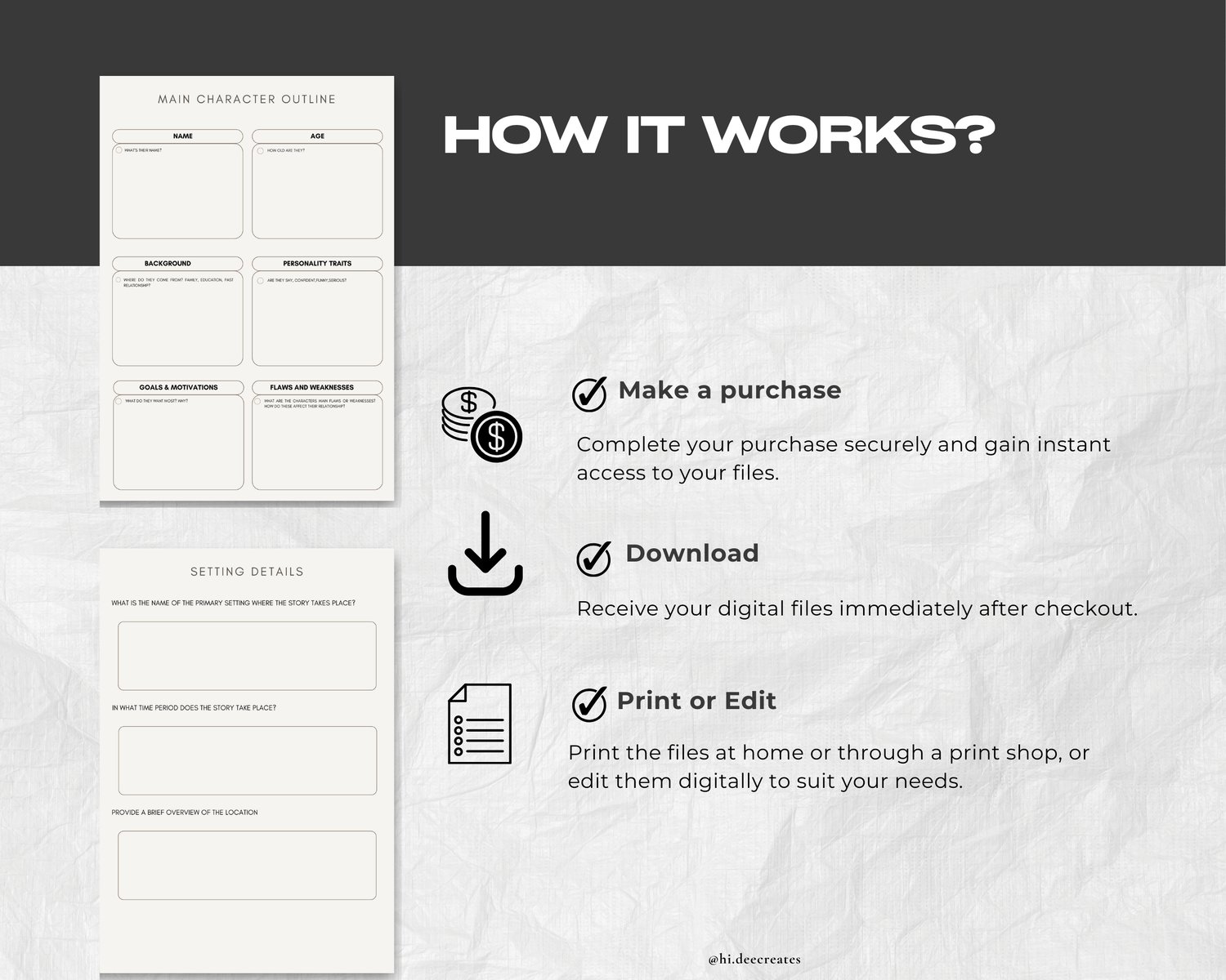 This easy-to-use template provides a structured framework to help you outline your plot, develop characters, and plan key story elements. Whether you’re writing a sweet love story or a passionate drama, this guide will keep you organized and on track.