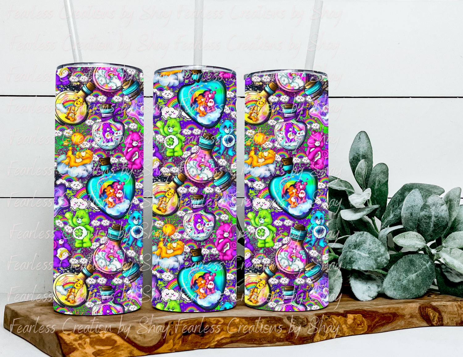 It holds 20 oz of your favorite beverage; has a plastic lid and comes with a reusable straw.