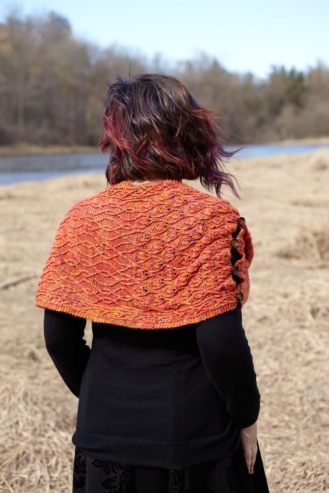 Shown In: Wooly Wonka Fibers ‘Nimue Sock’, (435 yards/398 meters; 50% merino, 50% silk; 3.53 oz/100 grams per skein). 2 skeins of Bonfire. Buttons sourced from