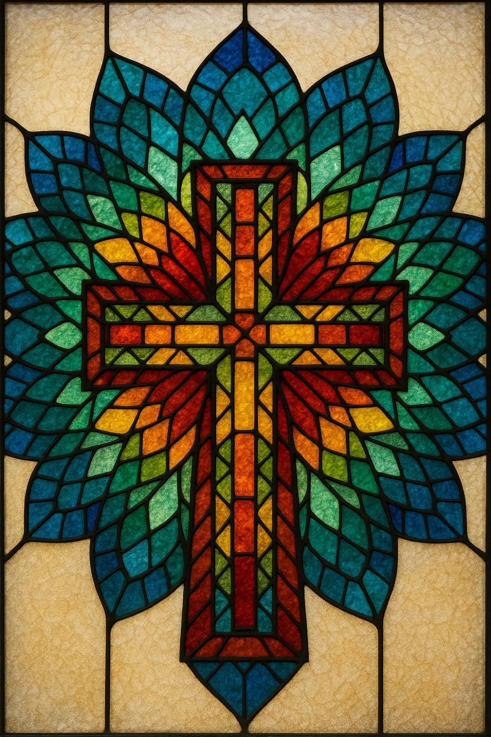 - ✝️ Central cross in warm stained glass tones: red, orange, and yellow