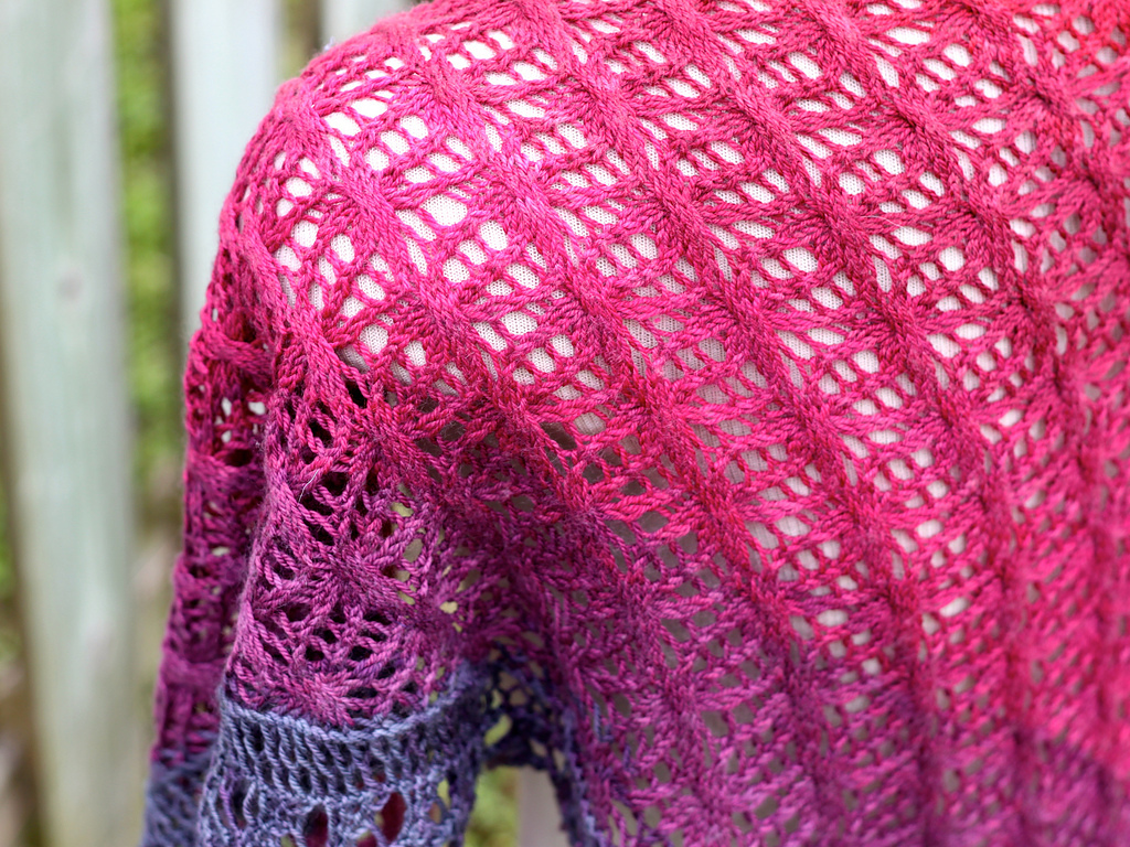 When it comes to ombre yarns like Twisted Fiber Arts, asymmetrical is the way to go. This shape makes the most of the beautiful color shifts without looking like giant stripes. The cables and eyelet lace pattern in this shawl give the wearer the best of both worlds – cozy and airy at the same time. The gorgeous colors in the Twisted Fiber Arts yarn deserve to be put on display, and this lovely wrap is a showpiece.