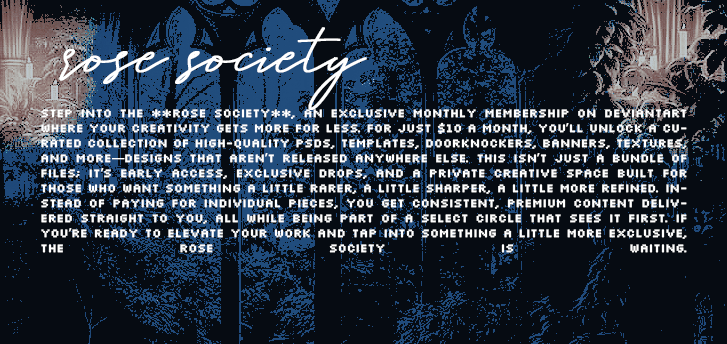 Step into the Rose Society, an exclusive monthly membership on DeviantArt where your creativity gets more for less. For just $10 a month, youβll unlock a curated collection of high-quality PSDs, templates, doorknockers, banners, textures, and more designs that arenβt released anywhere else. This isnβt just a bundle of files; itβs early access, exclusive drops, and a private creative space built for those who want something a little rarer, a little sharper, a little more refined. Instead of paying for individual pieces, you get consistent, premium content delivered straight to you, all while being part of a select circle that sees it first. If youβre ready to elevate your work and tap into something a little more exclusive, the Rose Society is waiting.