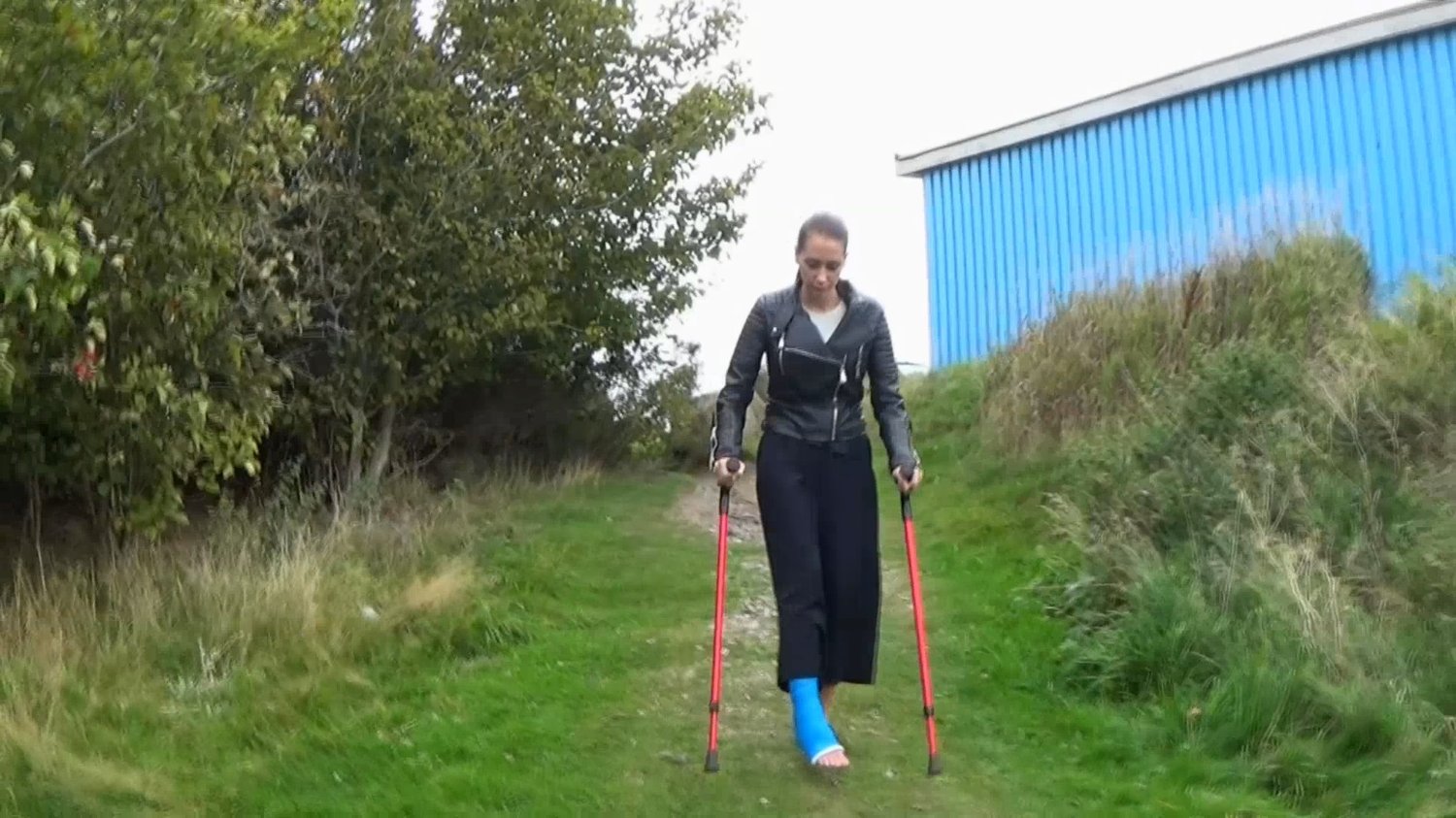 Sunshine jumps out of the car on one leg, puts on her leather jacket and takes her crutches from the back seat of the car.She crutch from the car down for a slope that does not seem to be made to use when you have crutches and a blue short leg cast but since this is not the first time Sunshine uses crutches, this is not a problem for her.We will then follow when Sunshine goes to a barbecue place where she sits down to rest for a while before continuing down to the sea