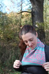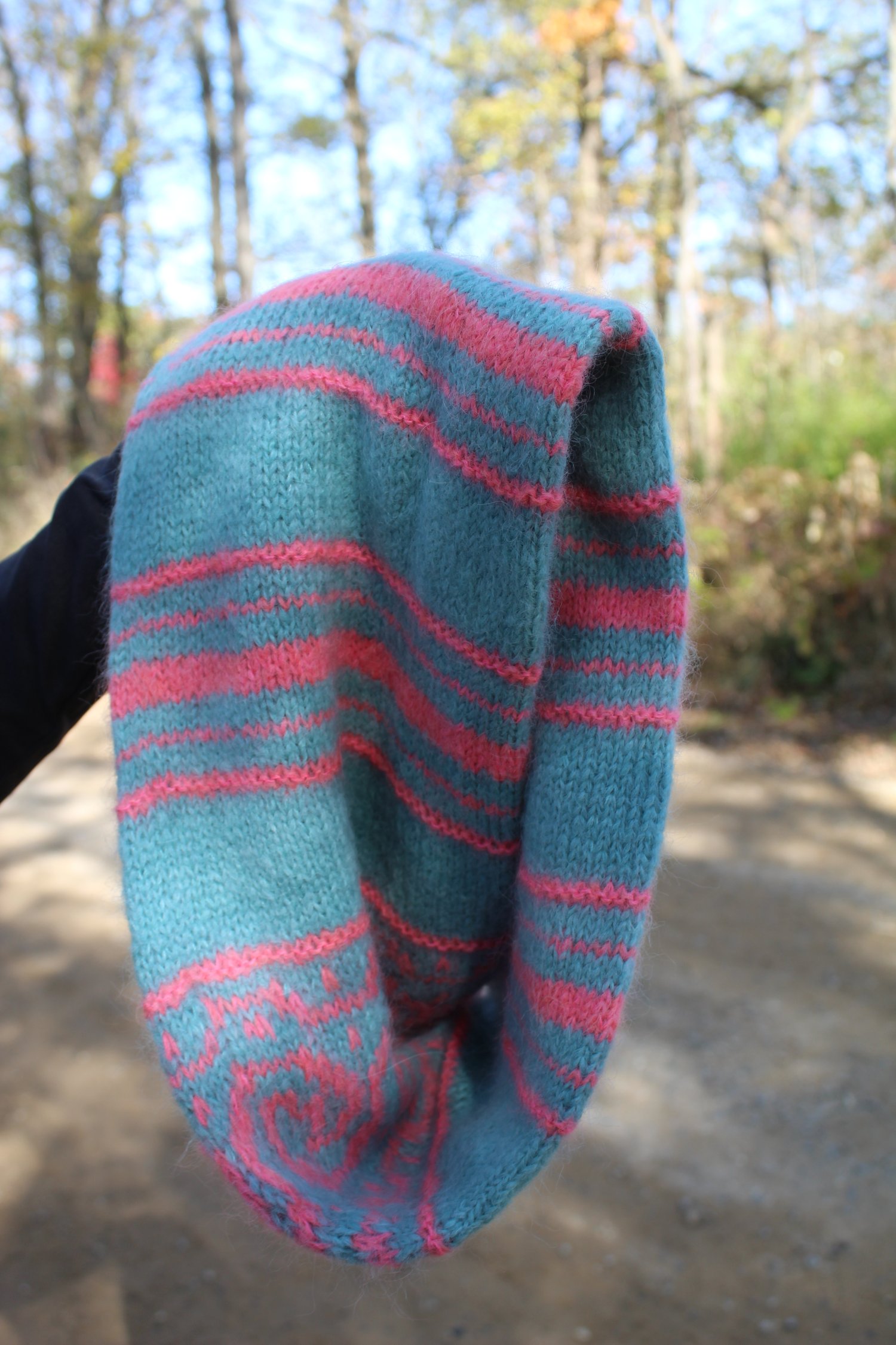Phi is a two color Möbius cowl. It features an adorable swirly colorwork pattern surrounded by relaxing stripes. It is knit in a tube in the round and then twisted to form a Möbius strip before grafting the ends together. It is knit using Dimond Laine Birdie held double to create a soft, fluffy fabric that is perfect for snuggling in.