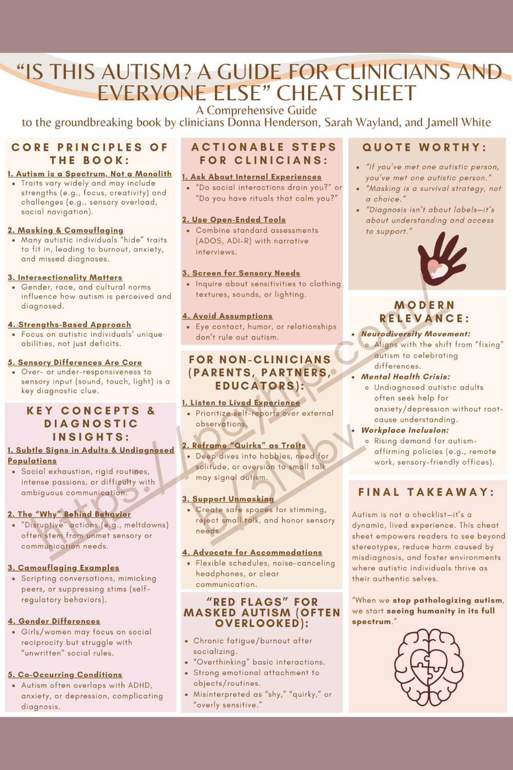 Authored by clinicians Donna Henderson, Sarah Wayland, and Jamell White, Is This Autism? challenges outdated stereotypes and offers a modern, nuanced roadmap for identifying autism in individuals who don’t fit the "typical" mold—particularly women, girls, gender-diverse individuals, and those who mask effectively. This cheat sheet distills the book’s groundbreaking insights into actionable tools, helping clinicians, educators, parents, and autistic adults recognize subtle traits, navigate diagnostic complexities, and embrace neurodiversity-affirming practices.