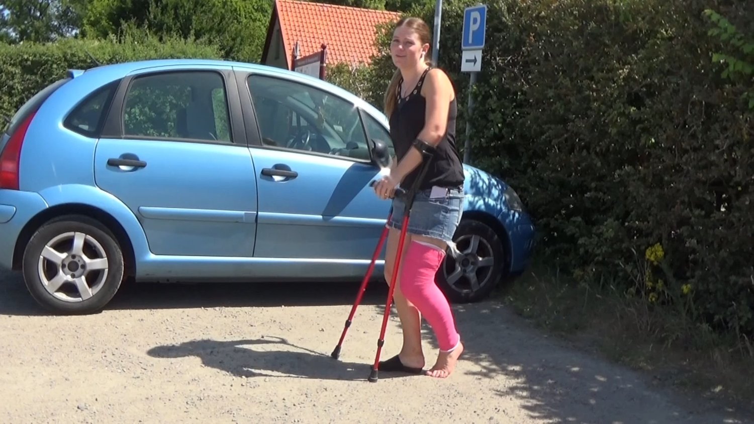 Ice is crutching in to the nice park with her cylinder leg cast.She has a black tank top, a jeans skirt and a slip in shoe on her right foot.Her left foot is still bare but the reso ff the leg is in a cylinder leg cast.This is a great crutching clip with Ice when she crutching around in the park.