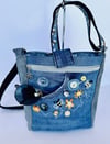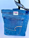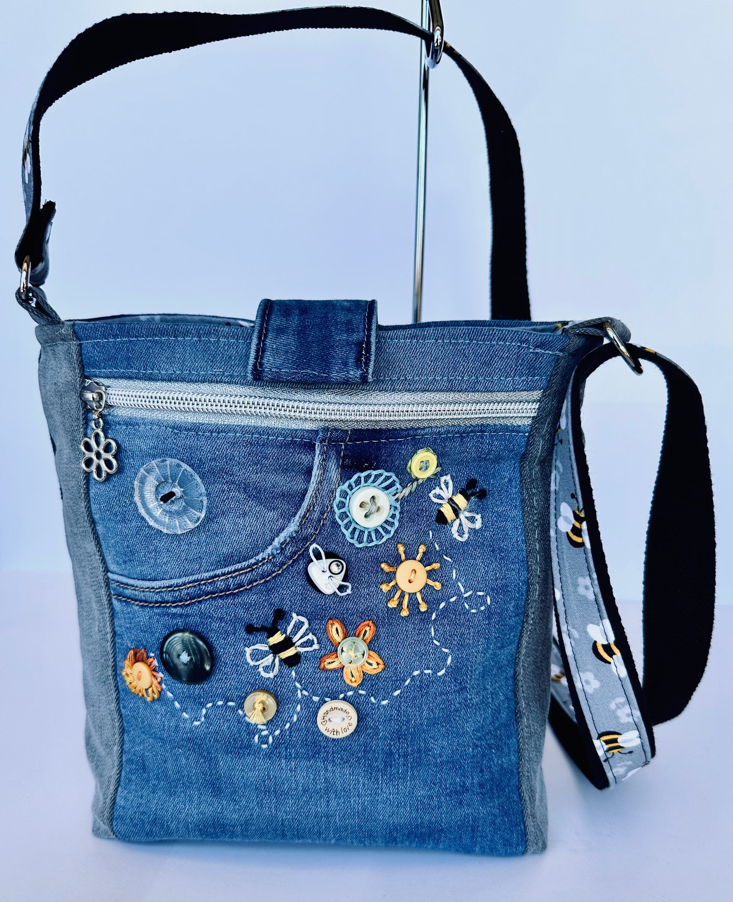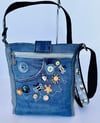 Polly has pockets! This medium (size varies a bit from 7-9” x 8-9” x 2-3”) crossbody bag features a fully functional original front pocket panel salvaged from upcycled denim jeans. It has been embellished with hand embroidery (to compliment the interior fabric), and buttons and/or beads. The back and sides are made from multi-colored upcycled denim. A large zipper pocket on the front has a flower pull tab and an upcycled pocket on the back completes the exterior.