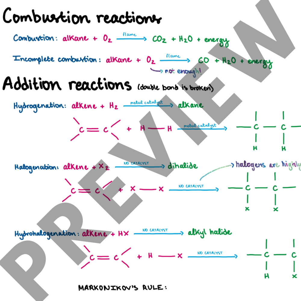 Study material for Exam 1. Visual description of each type of reaction, such as combustion, addition, substitution, and redox reactions.