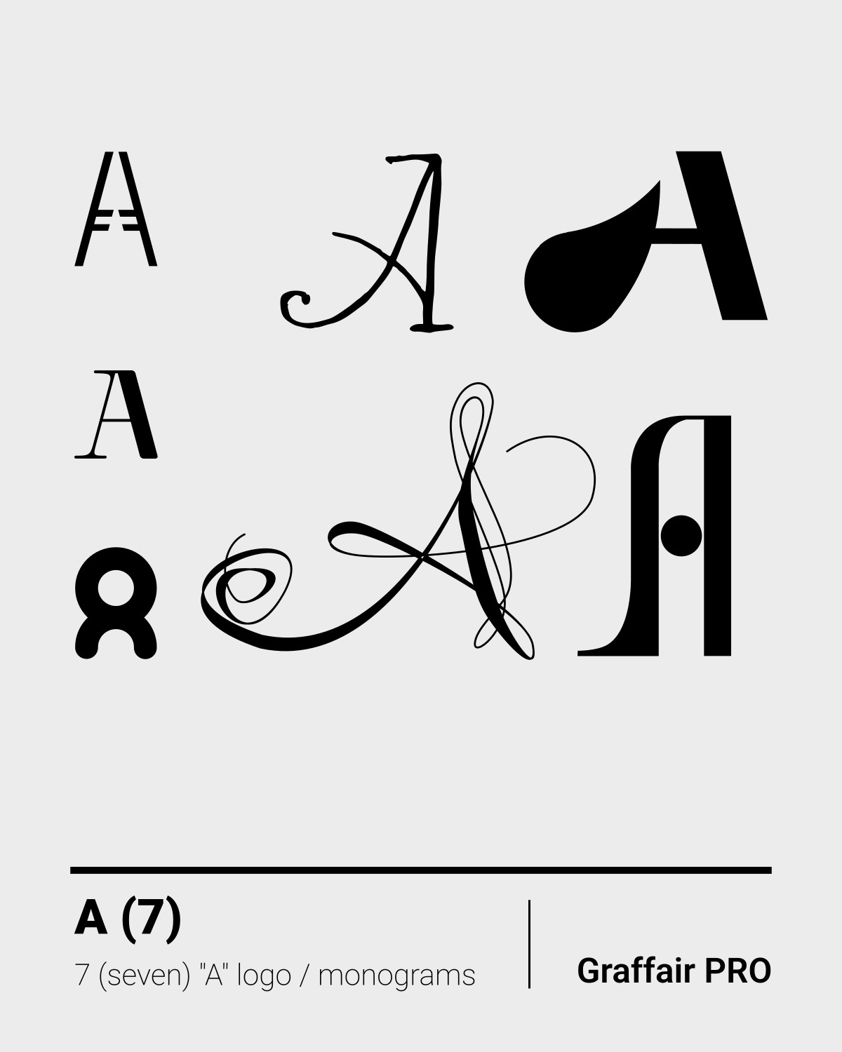 A (7) Monograms: The seventh set of 7 (seven) A's logo monograms, out of 84 ones, that you can find amongst the "1050 SVG Monograms" super package, which comes with an Index catalog.