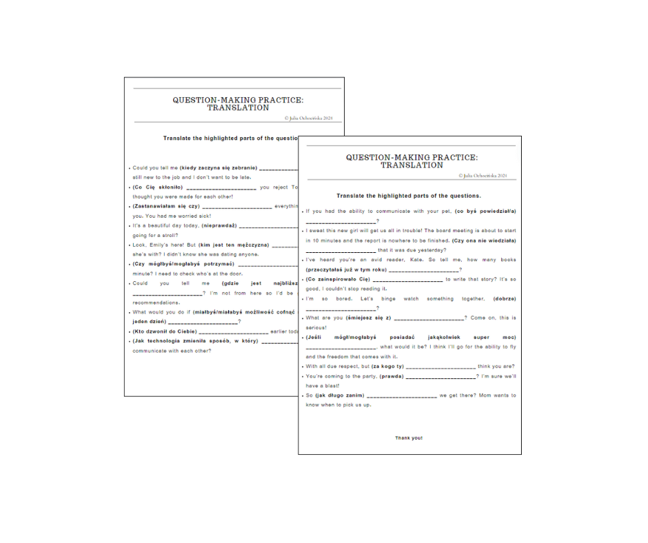 This short worksheet serves as a perfect revision of question forms in English – including direct, indirect, hypothetical, tag questions and more. There are 20 sentence fragments to translate (PL → ENG), designed to encourage active recall and accurate use of various question structures in context.