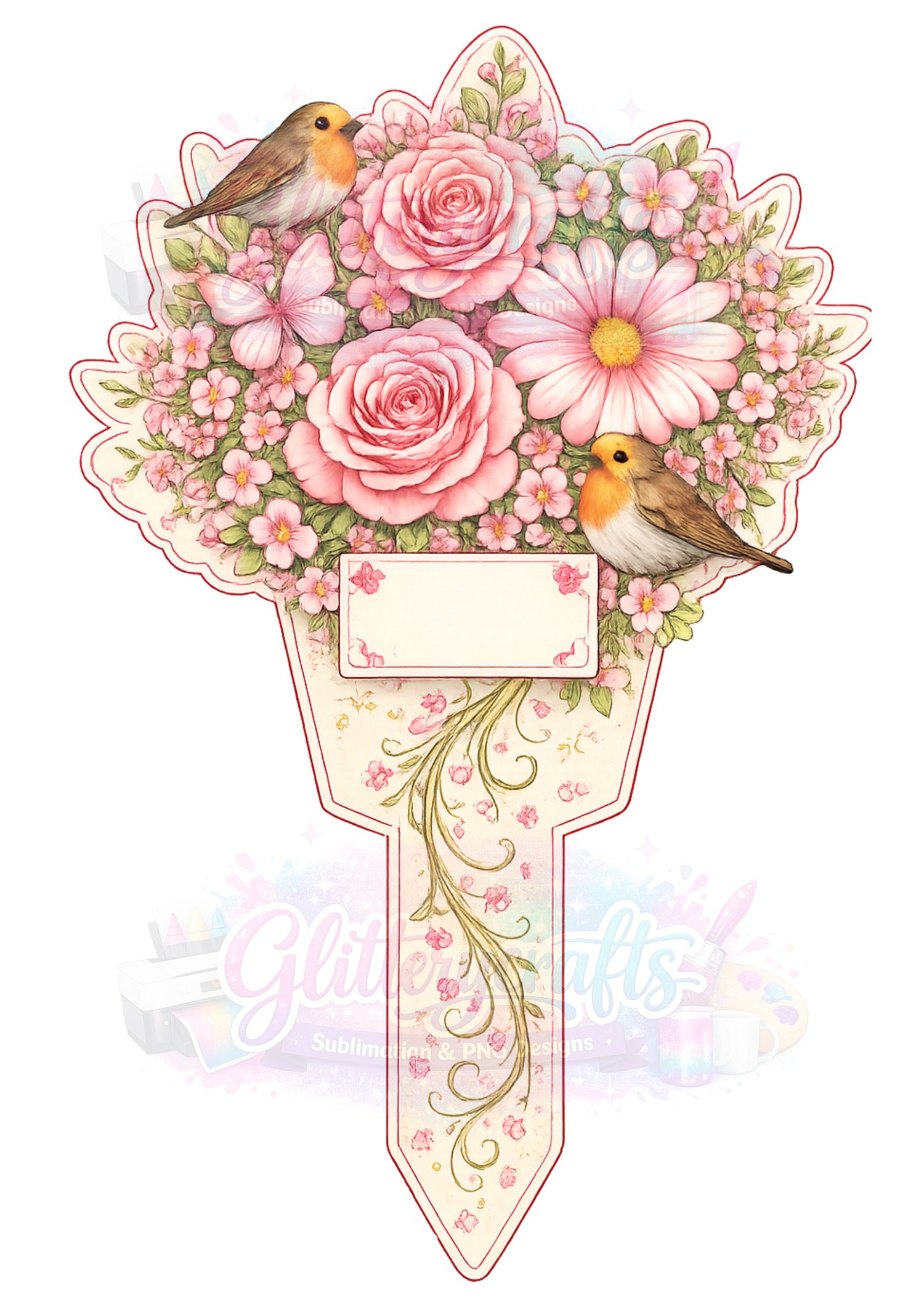 x 2 Grave markers pink and blue with robins and flowers and blank plaques for you to add your own name. These fit the woodform flower grave markers.