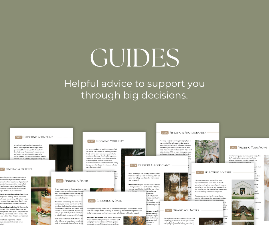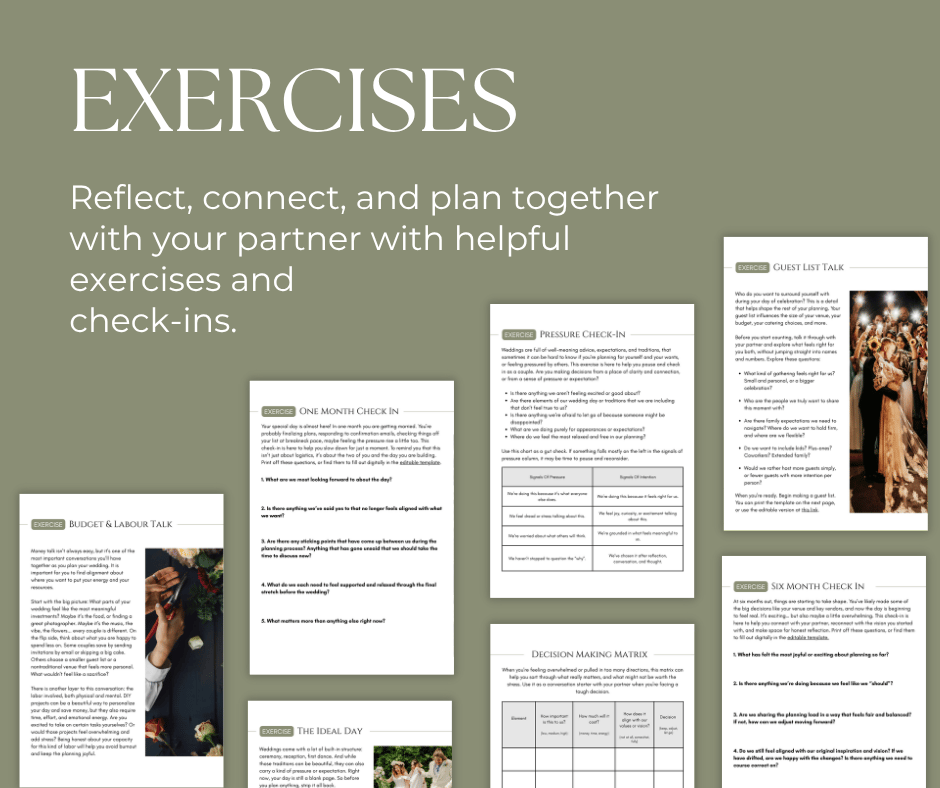 Many wedding guides are all about following trends, and can make you feel pressured to do everything under the sun because you see it there. This isn't about that. It’s a clear, supportive planning tool for couples who care about creating a meaningful day— without the pressure to do it a certain way. It includes practical templates, helpful exercises and guides, and useful tools to help you make confident, thoughtful decisions that are aligned with your intentions for your day.
