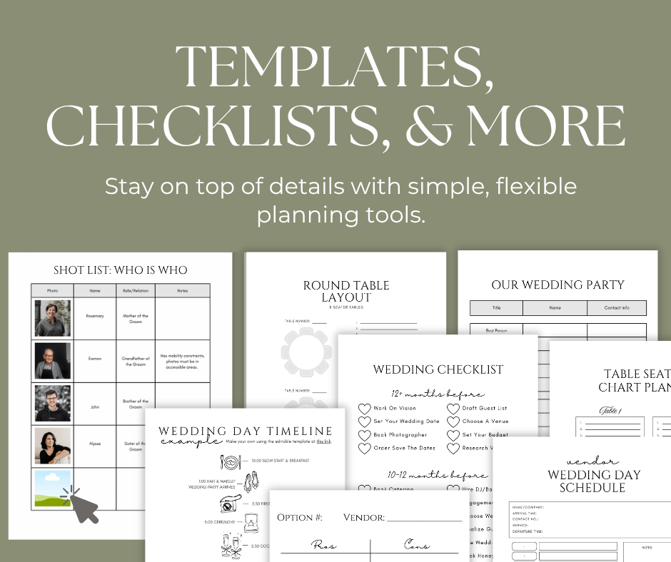 This isn’t your typical digital wedding planner— you’ll find far more than checklists here. This guide is organized to walk you through each stage of the planning process, with practical tools and reflection points along the way.