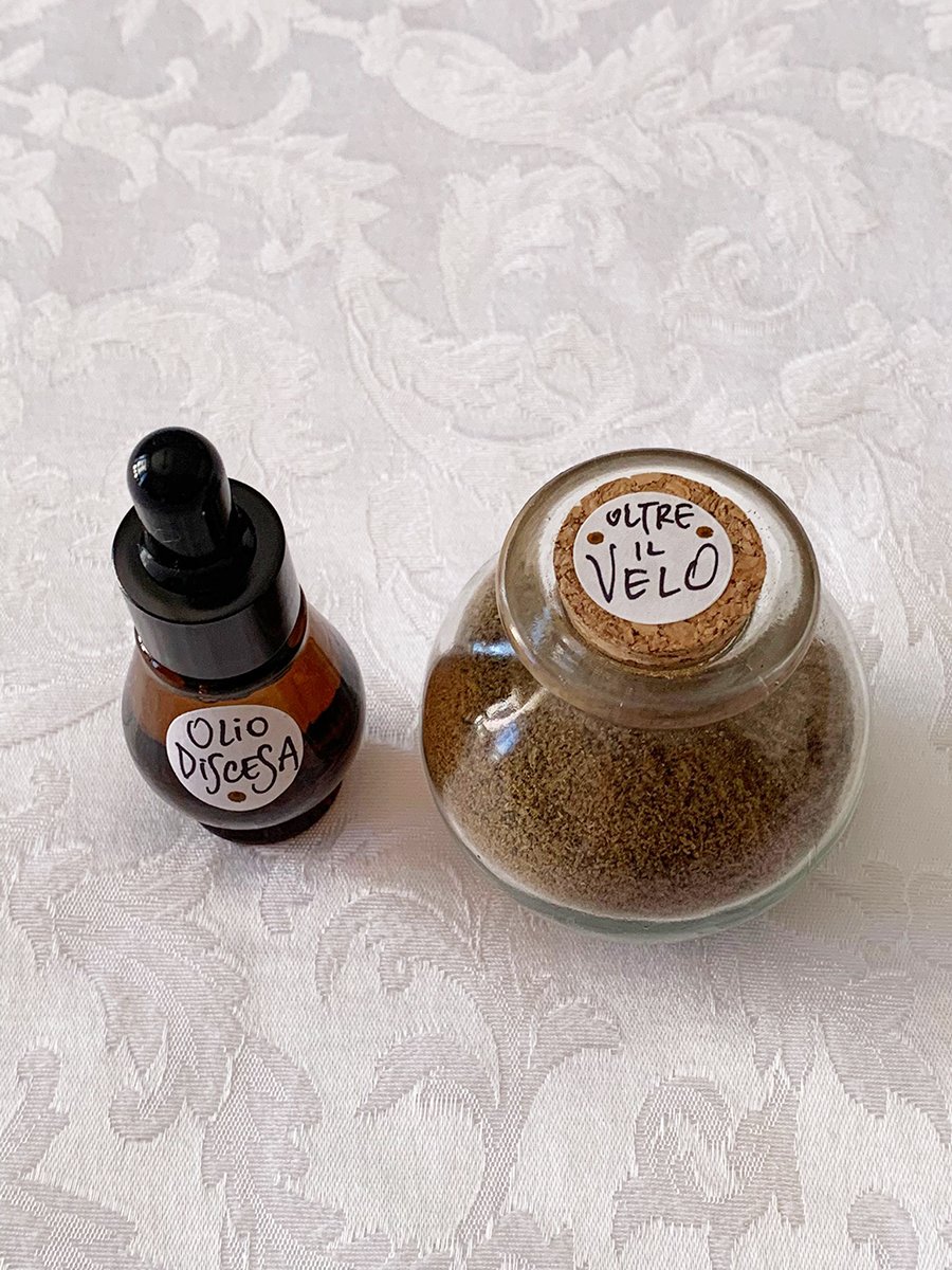 Il secondo strumento è l'Olio Discesa, composto da tre oli essenziali che facilitano il focus per connettersi ai mondi altri. Il tutto in olio vettore bio. E' una misccela aromatica che si può utilizzare per ungere le candele, sui bruciaessenze, ecc.