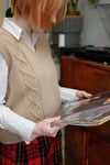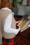 The fronts are worked first, followed by the back. Fronts and back are then joined onto one circular needle and the body is worked in the round towards the hem. Stitches for the ribbed edges on neck and each armhole are picked up next and each ribbing is worked in the round.