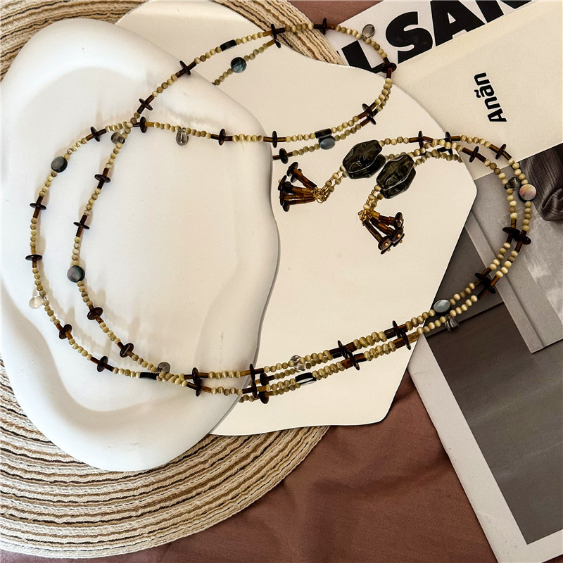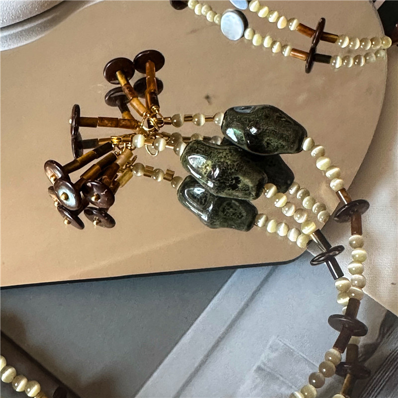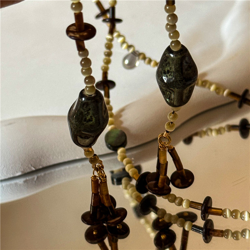 Handmade ethnic boho vintage style natural stone shell cat's eye ceramic stacking long necklace