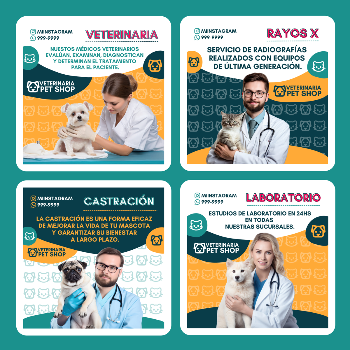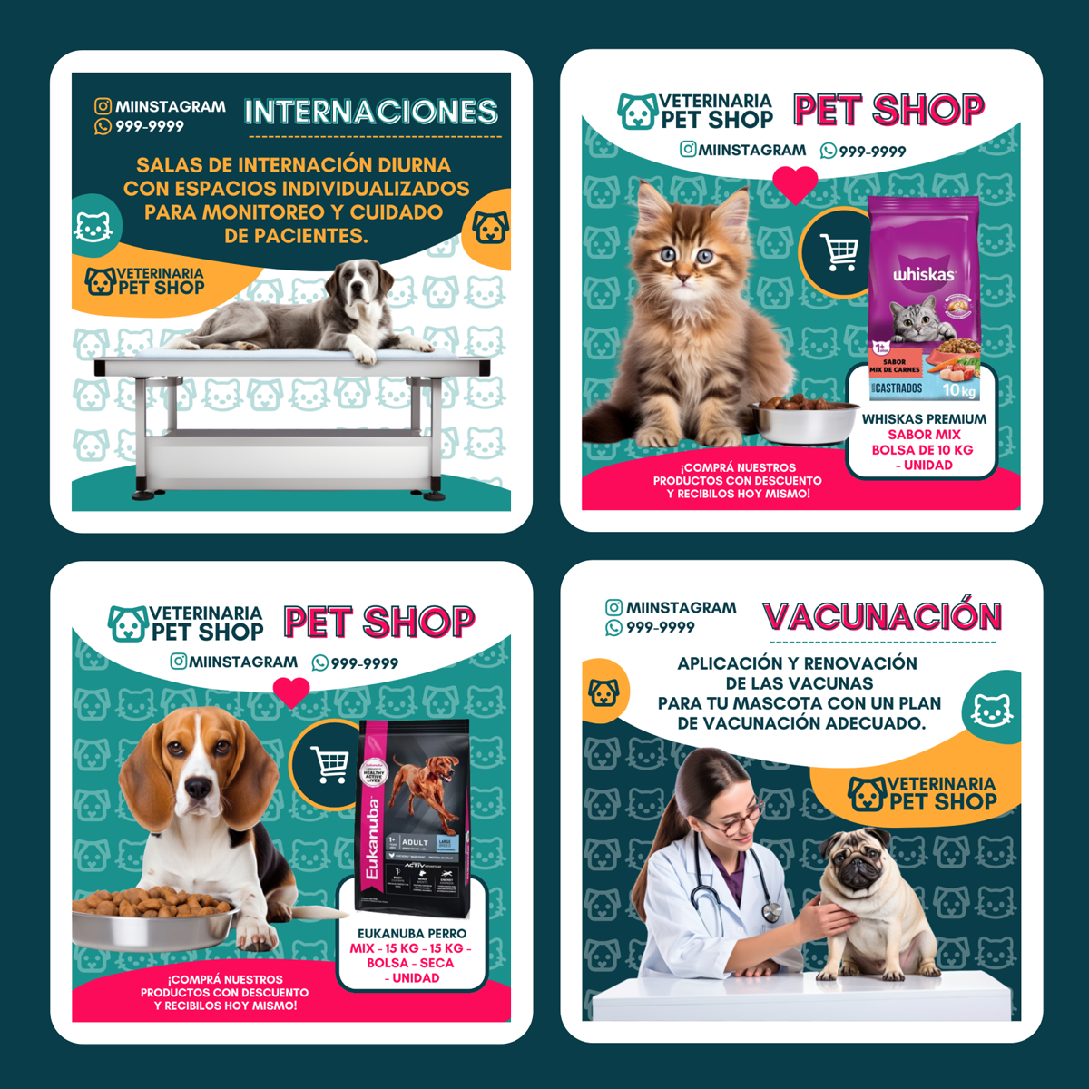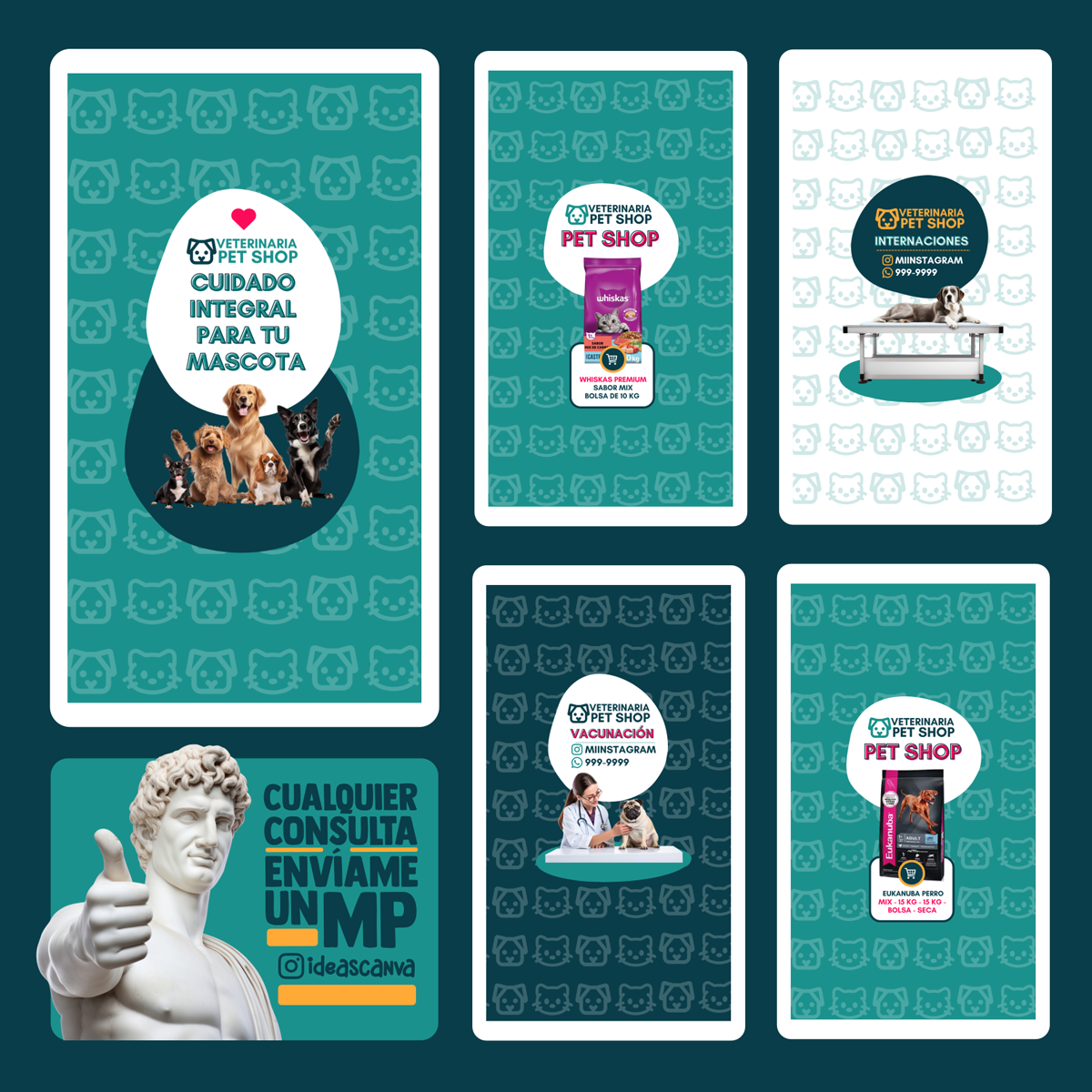 Plantilla Veterinaria , diseño ideal para Veterinarias / Pet Shop. Edita textos, colores, imágenes y elementos fácilmente adaptando estos diseños a la temática de tu emprendimiento / negocio usando nuestras plantillas para Canva.