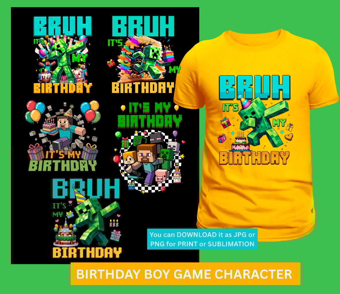 Get ready to power up the party with this epic set of 6 Game Character Birthday Shirt Templates – perfect for the ultimate gamer celebration! Each design features a bold, colorful game-inspired character with fun birthday graphics, perfect for the birthday boy and his crew.