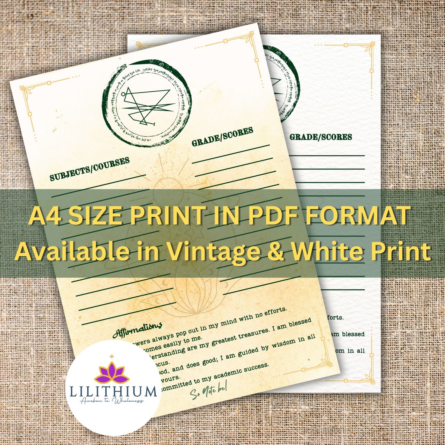 Simply print your chosen design and fill in the "Subjects/Courses" column with your specific subject or course, along with the desired grade or percentage you wish to manifest in the "Grade/Scores" section. Place the print in a visible spot—such as your study desk, bedroom, or vision board—where it can constantly remind you of your goals. For best results, we recommend completing this process at the start of your course, program, or exam preparation to align your energy with your intentions from the outset.