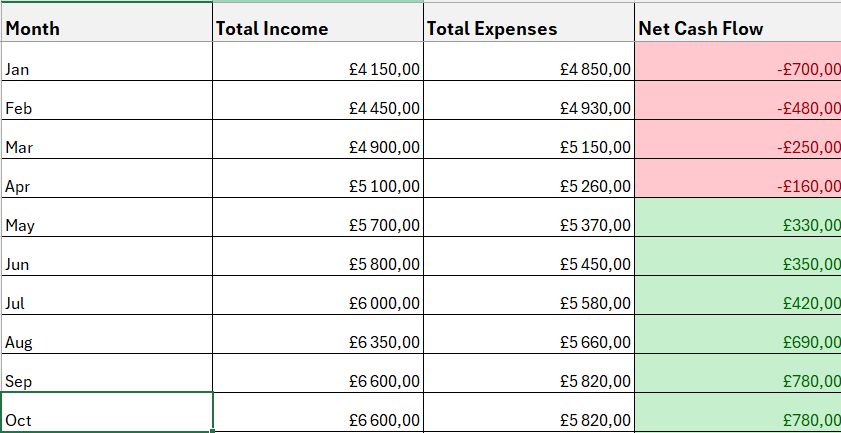 - Conditional formatting for easy identification of positive/negative cash flow