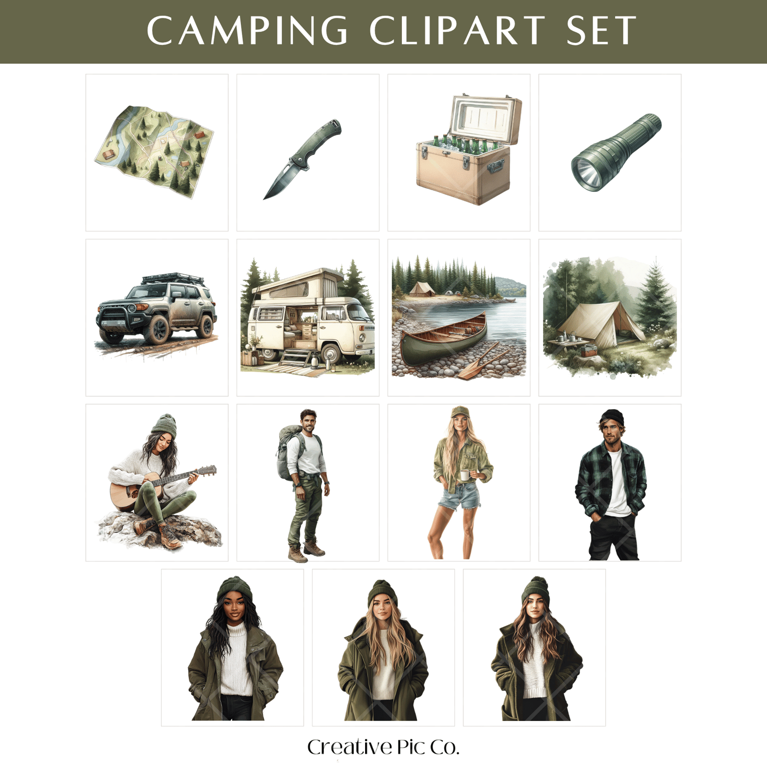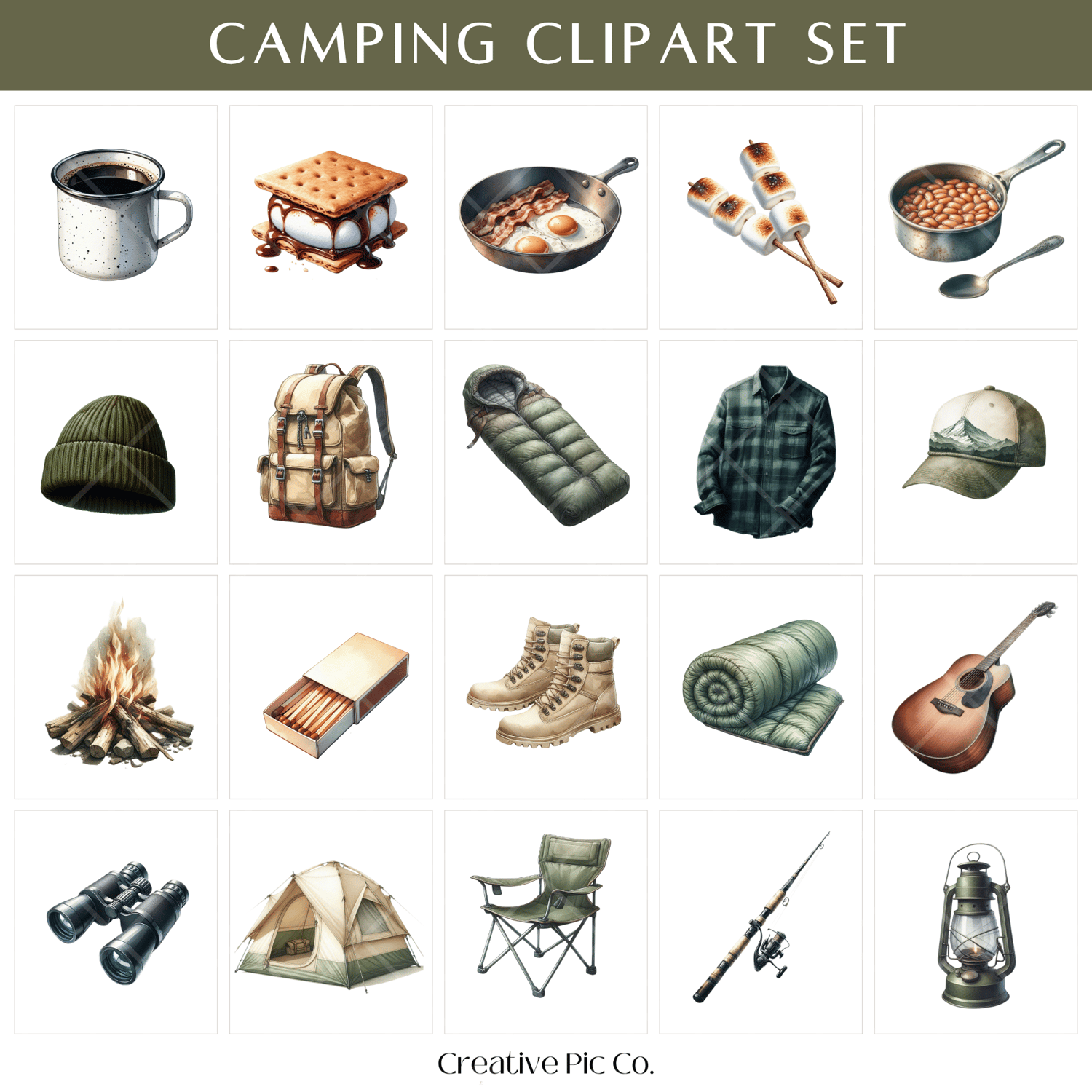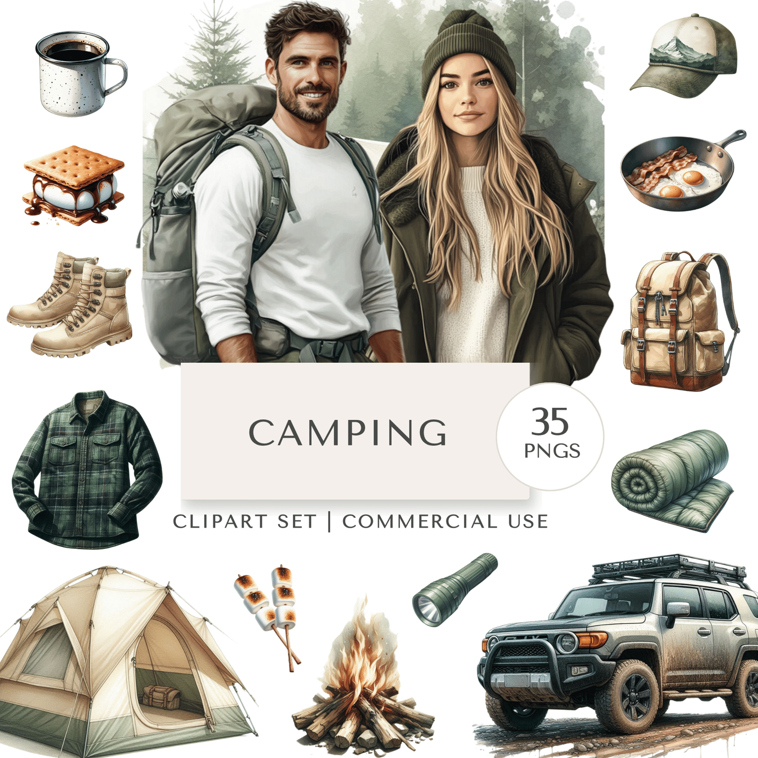 Bring the great outdoors to your creative projects with the Camping Clipart Set. This earthy, nature-inspired collection includes 35 PNGs featuring camping gear, cosy campfire food, forest-ready fashion, and adventure scenes. From boots and backpacks to tents, guitars, and s’mores, every piece captures the essence of a relaxed wilderness getaway. It’s perfect for planners, small business branding, event invites, or anything needing a rugged, outdoorsy vibe.