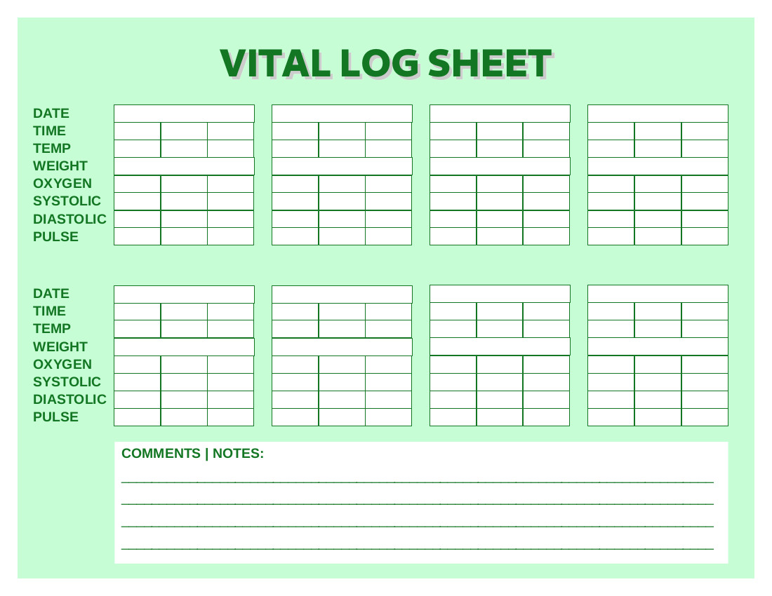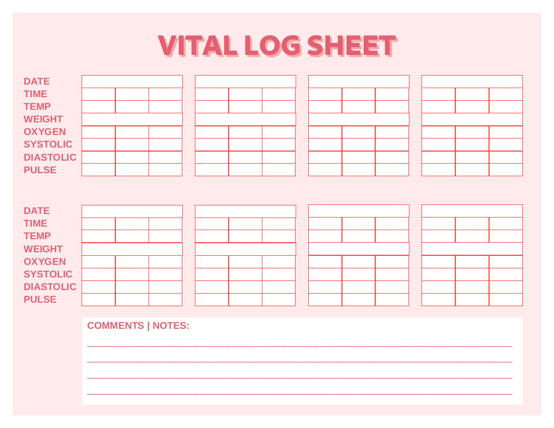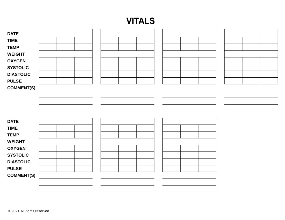 Stay on top of your health with our free comprehensive Printable Vitals Log, comes in Black, Blue, Green and Red. This easy-to-use log is designed to track vital health metrics over a seven-day period, all on a single page. It includes sections for: