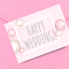 Delicate  pink card with "Happy Wedding" written inside pink frame. Irridescent decorations. Sweet, simple, sophisticated. Great for LGBTQ and same-sex couples too!