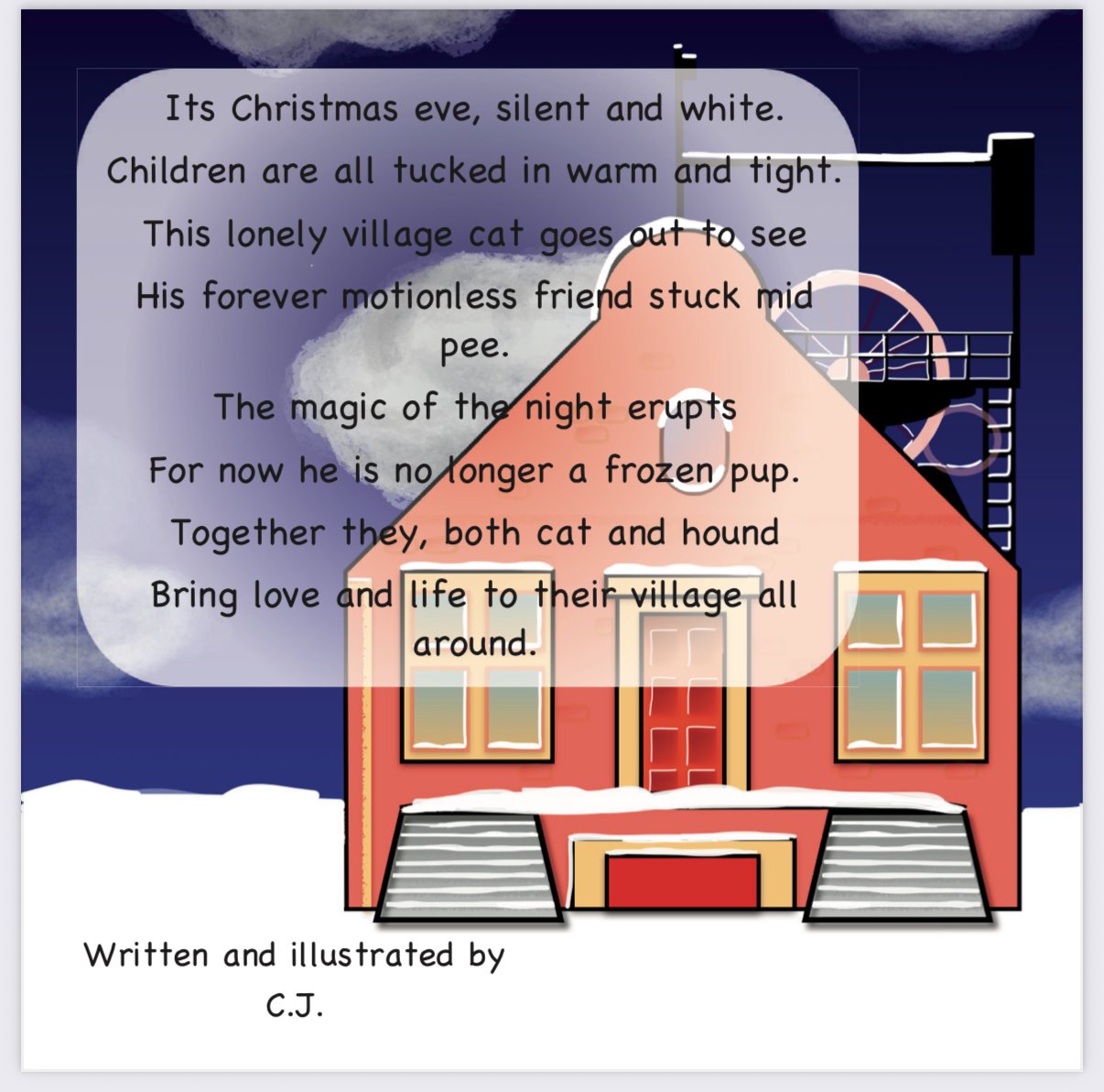 Mo has a Christmas Eve adventure around his newtongrange village with his new friend - a statue brought to life by the magic of Christmas . With illustrations like the mining museum, the Nitten star football club, the primary school and the Peeing Dug “statue” your wee one will enjoy this thrilling adventure with places they can actually visit.