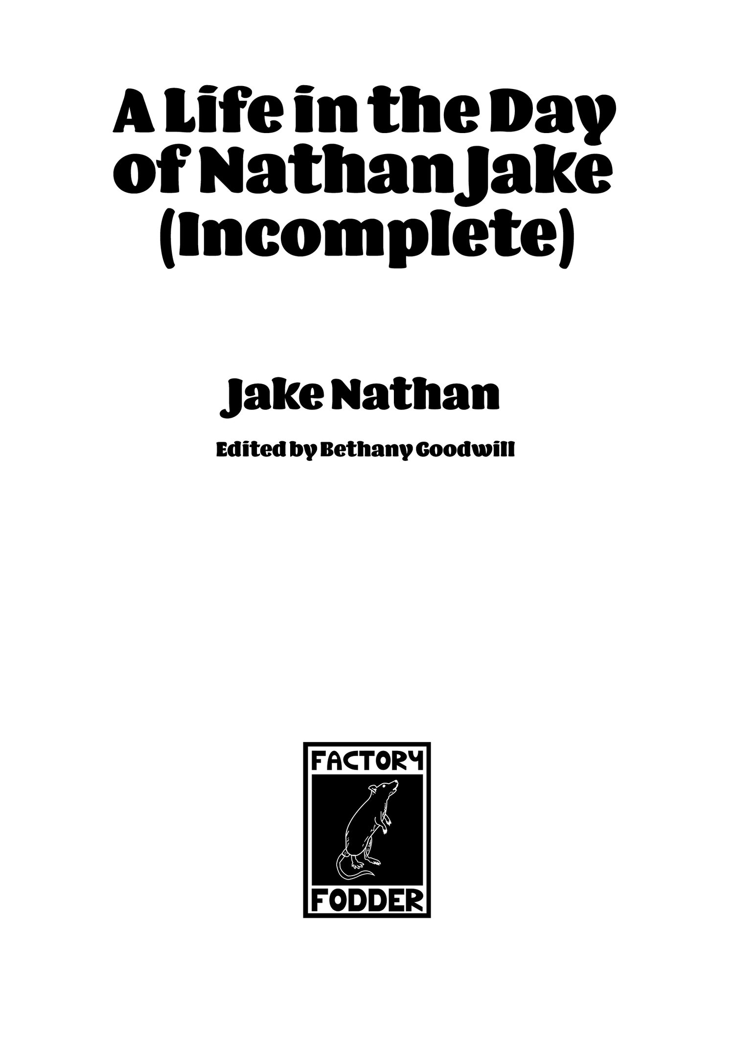 A Life in the Day of Nathan Jake (Incomplete) is the debut pamphlet from poet Jake Nathan. Combining two of his passions, the pamphlet is composed of poems written to the titles of hip-hop songs.
