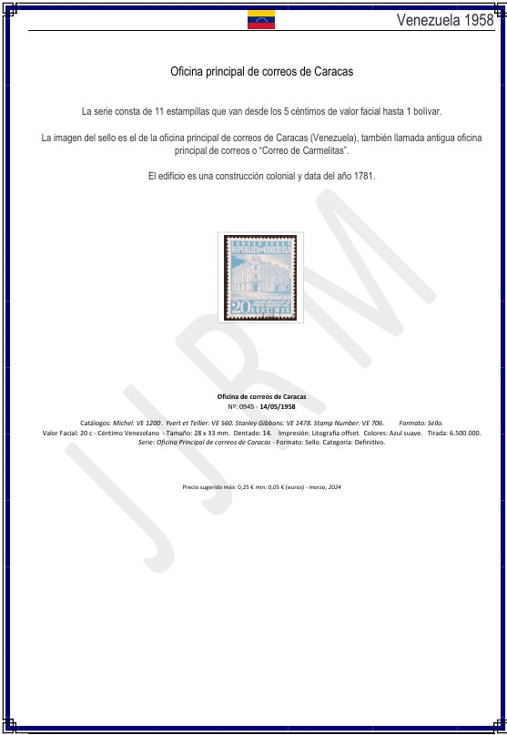 Esta ficha en formato PDF A4 (21,0 × 29,7 cm / 8,27 × 11,69 in) corresponde al sello de Venezuela emitido en 1958, dedicado a la Oficina de Correos de Caracas. Está identificada con el número completo del Catálogo Sooluciones: VE‑1958‑00945, lo que facilita su organización dentro de cualquier archivo personal.