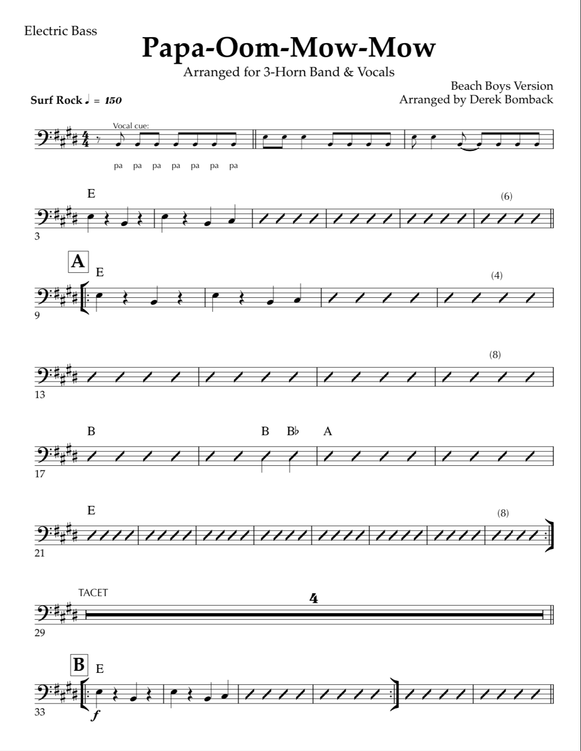 Papa-Oom-Mow-Mow. Key of E major. Arranged for 3 horn band and vocal (Trumpet, Alto Sax, Trombone, Guitar/Keys, Bass Guitar, Drums & Lyric Sheet).