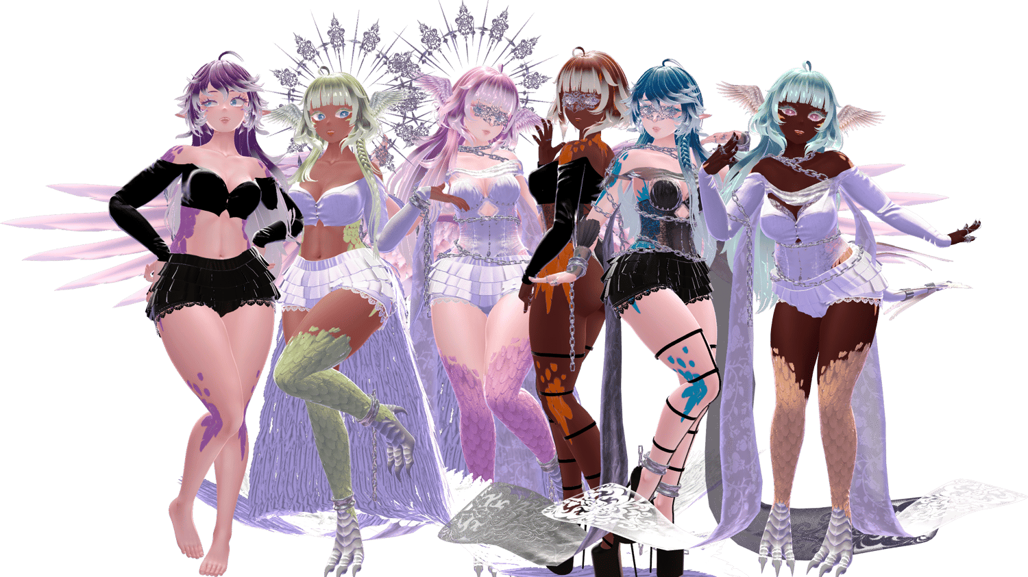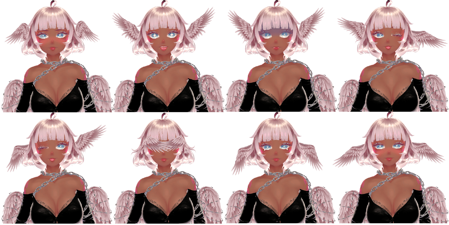 Head | Body | Short Hair | Long Hair | Feather Tattoos | Feathery Claws | Wings/Fallen Set | Tail | Sweater | Dark Aura Set | Bloomers | Rings | Matcap Pack | Gogo Loco | Jerry's VRCFT Templates | Wholesome SPS Configurator | Robust Weight Transfer | Separate by UV Tiles