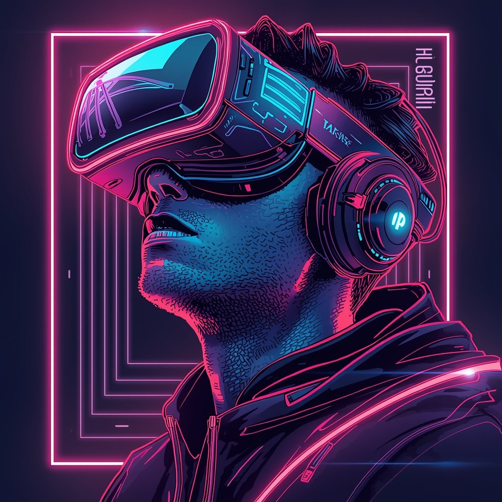 A futuristic neon cyberpunk portrait featuring a male character wearing a sleek VR headset, rendered with vibrant colors and high‑quality details.