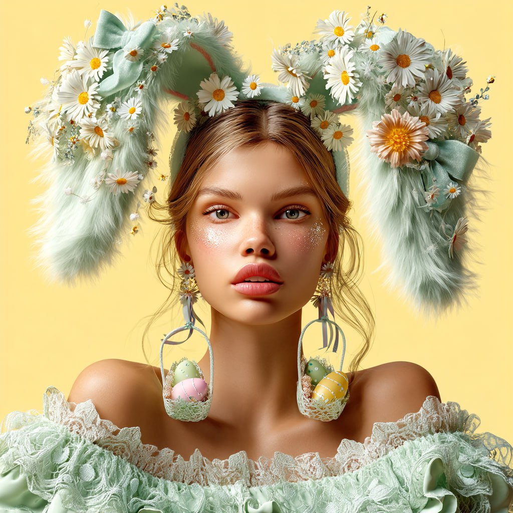 Bring springtime magic to life with this premium MidJourney AI prompt. Generate a photorealistic close-up portrait of a young woman with serene expression, flowing hair adorned with fluffy bunny ears, daisies, and pastel ribbons. She wears delicate Easter basket earrings and a pale mint green off-shoulder lace dress, illuminated by soft, natural light for a gentle festive mood. Perfect for artists, designers, and creatives, this ready-to-use AI prompt allows you to produce ultra-detailed, 4K resolution, charming Easter-themed imagery—not a pre-made image—giving you full creative control over every delightful detail.