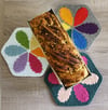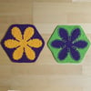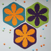 Here's a knitting pattern for a hexagonal potholder with a flower motif. It starts with a provisional CO, is knitted in short row wedges and finished with grafting in garter stitch.