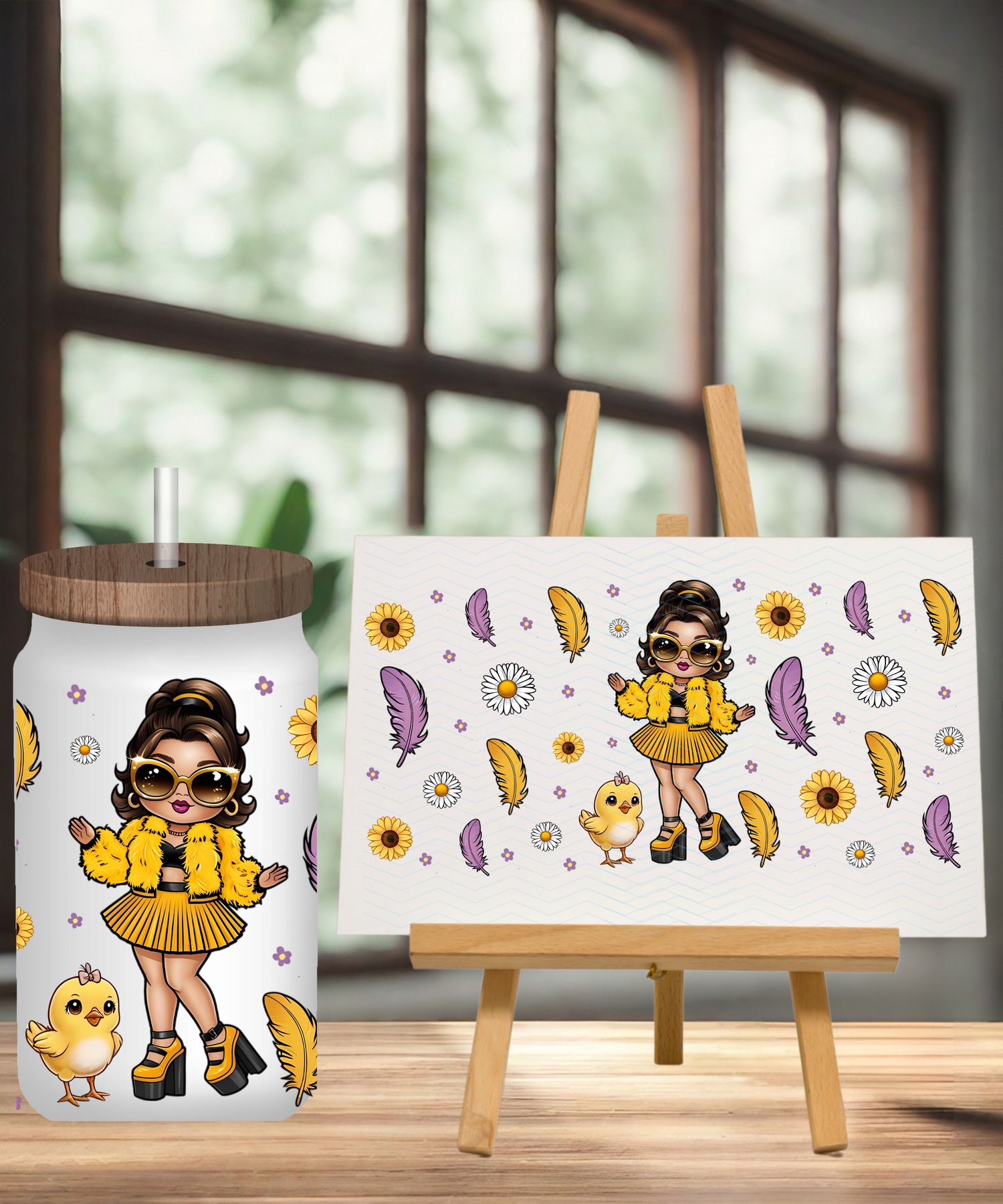 Springtime just got extra stylish with this Chic Chick Babe cup design! A glamorous babe rocks a feathery cropped jacket and platform heels, alongside a her bow-wearing baby chick. This adorable yet luxe design is perfect for Easter, spring brunches, or adding a cute pop to your daily sips!