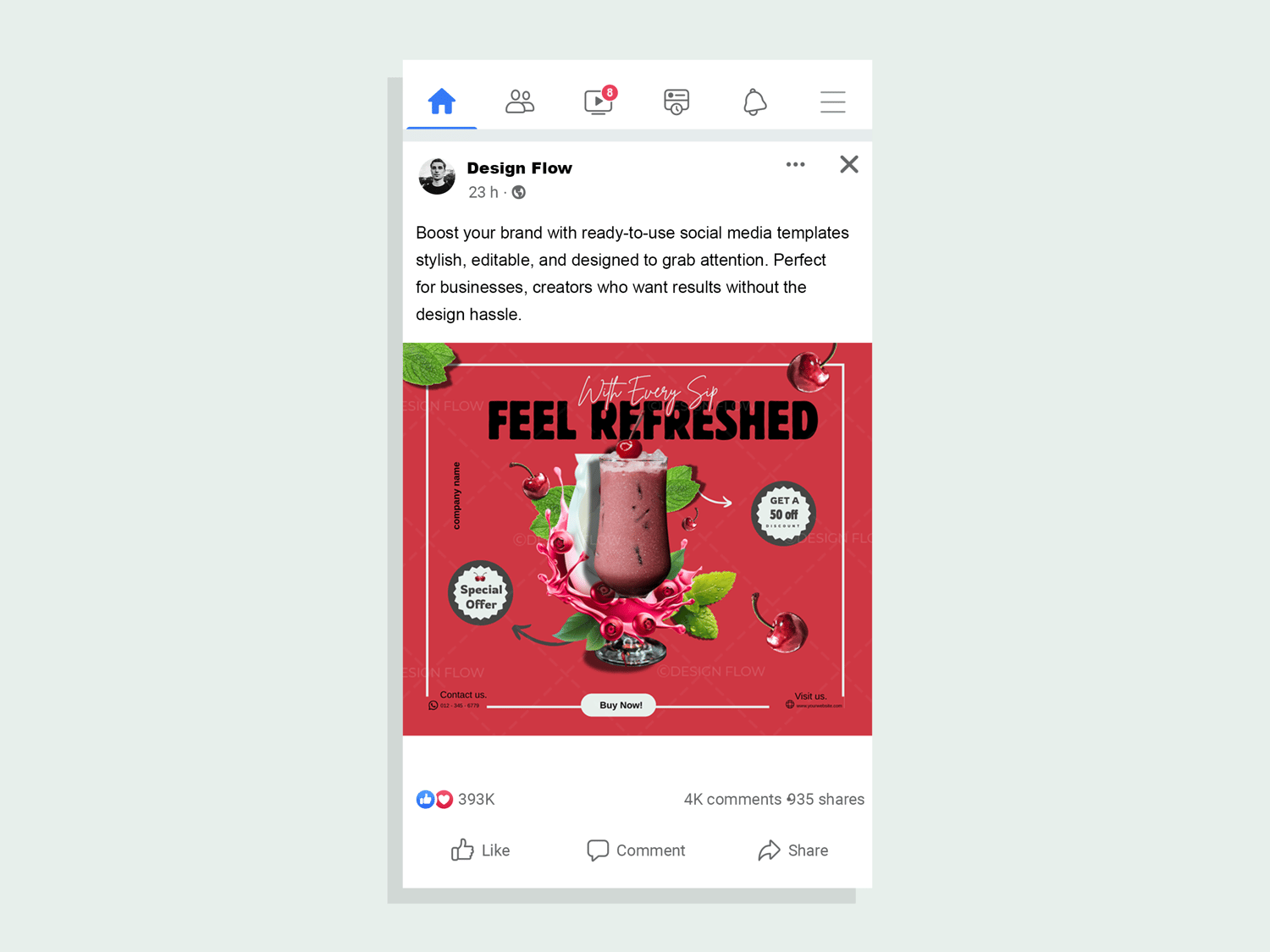 Promote your beverage brand with this Refreshing Juice Facebook Post Template. Designed with vibrant colors and a fresh, modern layout, this editable template is perfect for cafes, juice bars, smoothie shops, or healthy lifestyle brands.