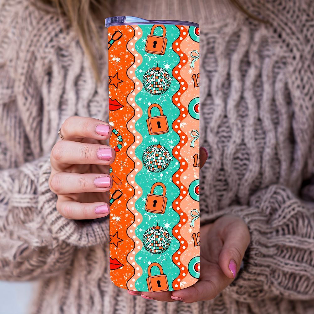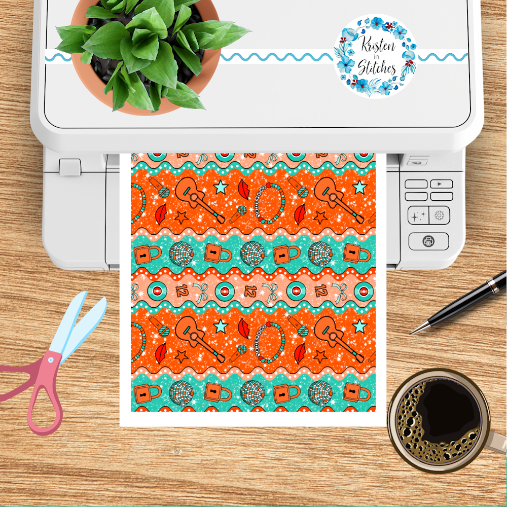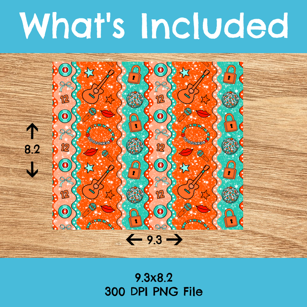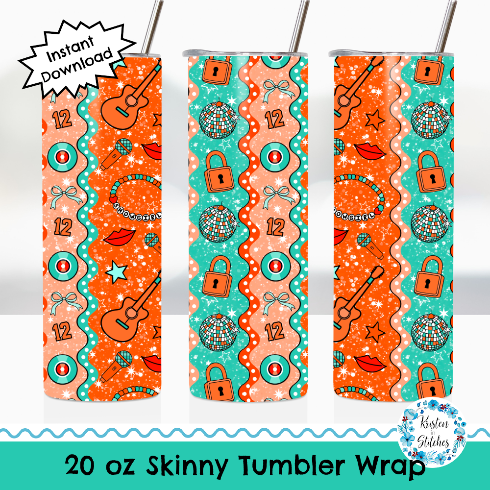 The pattern features pretty stripes in orange and mint with icons representing the Life of a Show Girl album. Perfect for a Taylor fan!