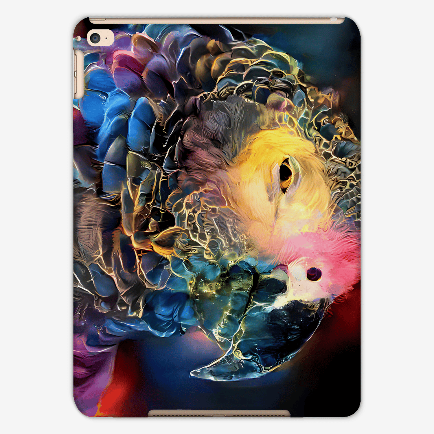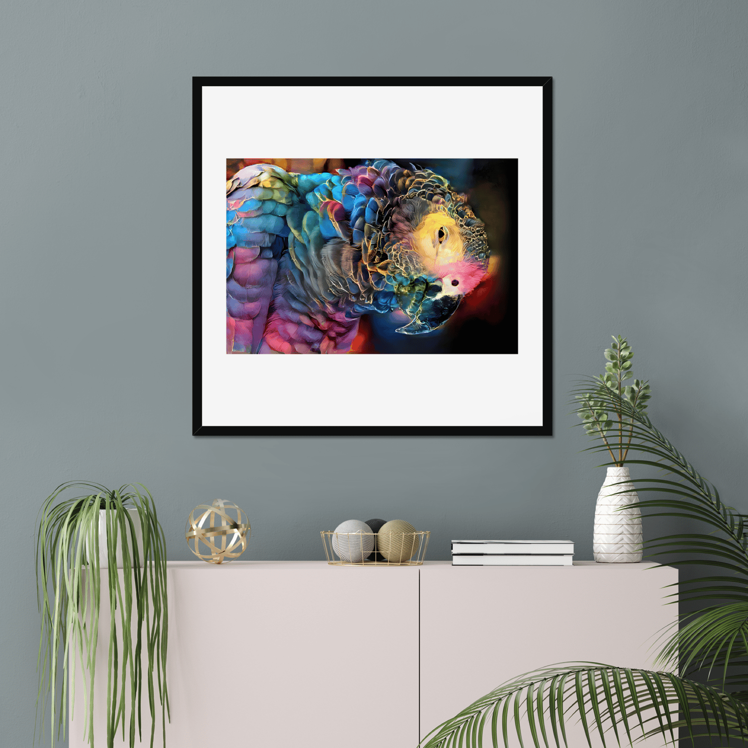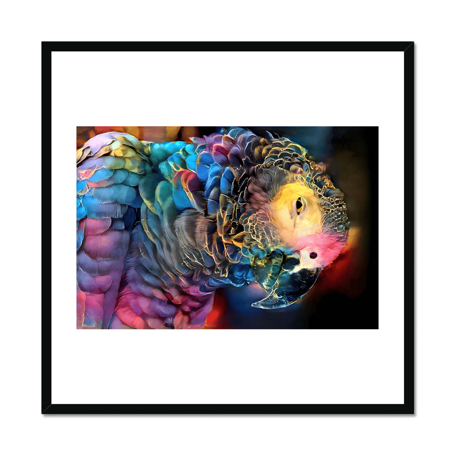This vibrant digital art print of a rainbow coloured parrot will instantly brighten up any space with its playful charm. The parrot's endearing smile and unique pose, leaning to the side, adds a touch of whimsy and character to the artwork, guaranteed to bring a pop of personality to any room in your home.