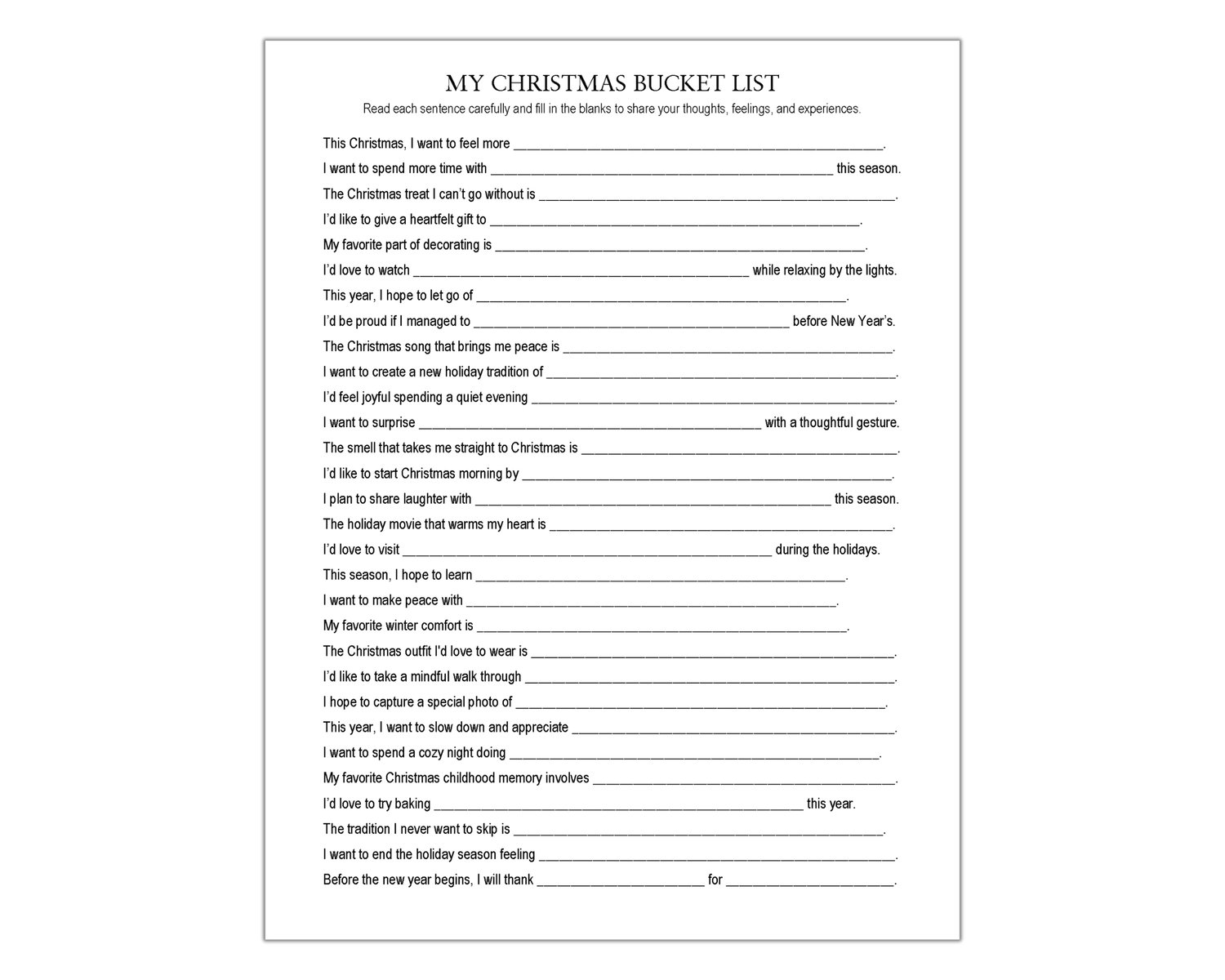 Get into the holiday spirit with this My Christmas Bucket List worksheet. This resource features 30 prompts to let you dream, plan, and celebrate everything you love about the season. Use it on your own or with friends and family to spark laughter and joy. Make this Christmas one to remember, one item at a time.