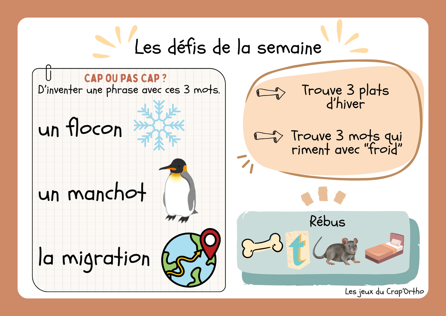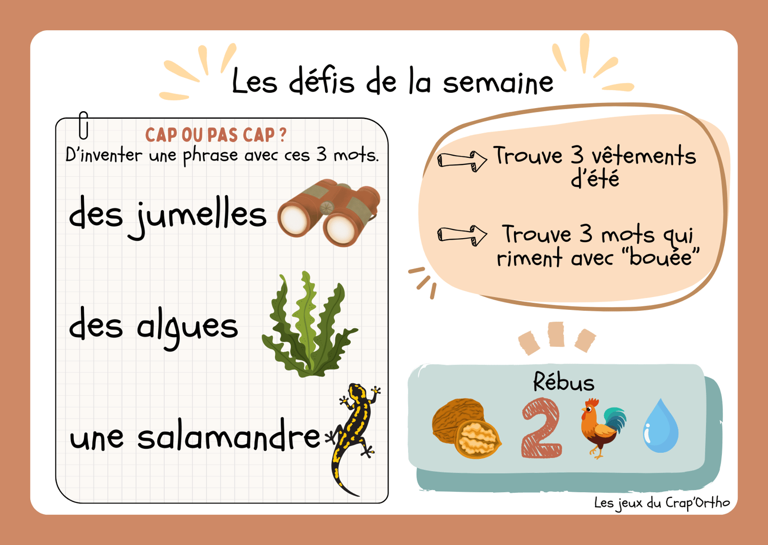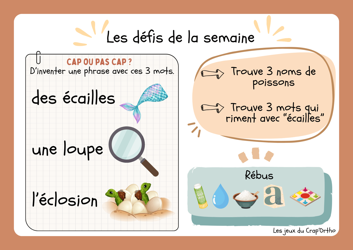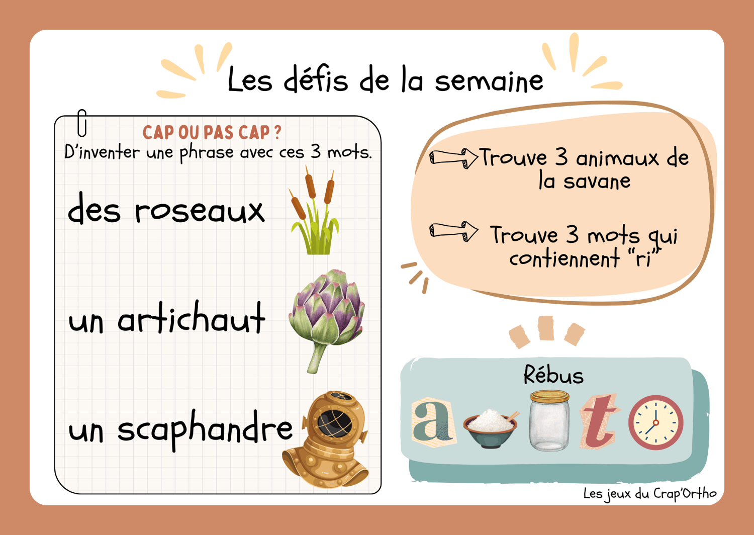 Mes patients et leurs parents attendent leurs défis chaque semaine avec enthousiasme. C’est devenu un petit rituel qui fait travailler le langage sans en avoir l’air et les mets déjà en réflexion. C’est également l’occasion d’avoir des moments d’échange parent-enfant.