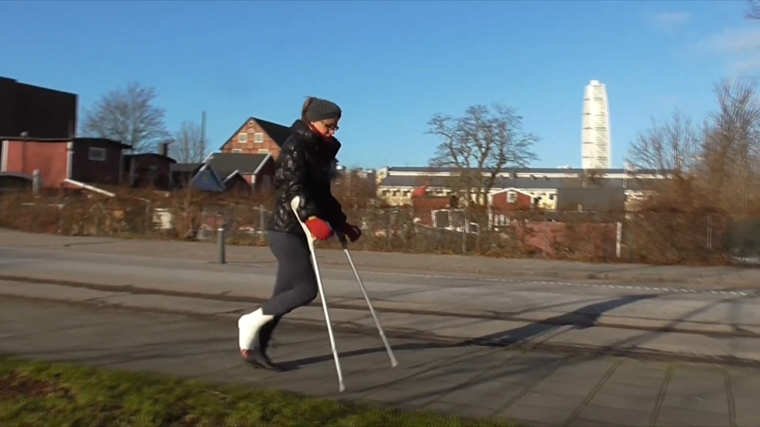 Sarah is still crutching around at the museum.She sets her crutches and jumps on one leg up a flight of stairs to look into a cockpit.After a while, Sarah decides to leave the museum and we can clearly see her white plaster cast.