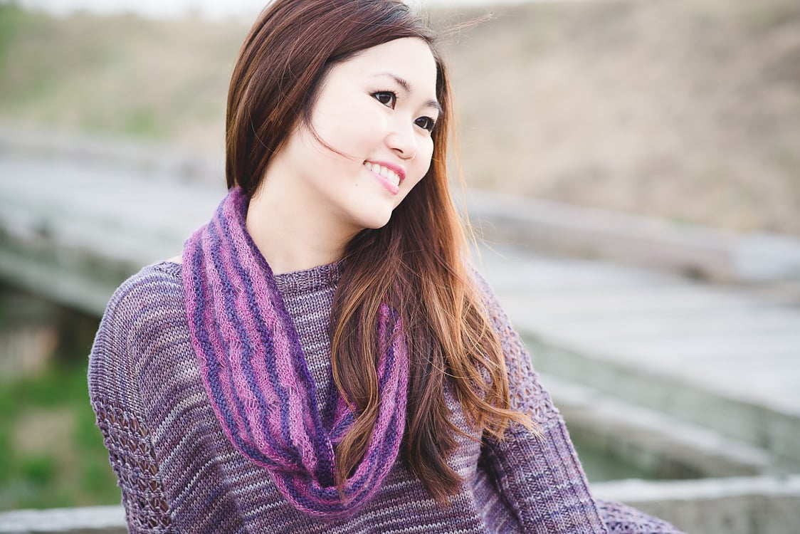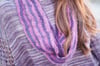 Bands of frothy Silk Mist lace alternate with Tough Love Sock garter stitch ridges in this elegant cowl. The bands of lace are first worked in stockinette stitch, then reverse stockinette, creating a reversible fabric. The increases and decreases in the lace push and pull the garter ridges around to create undulating lines like ripples in the sand.